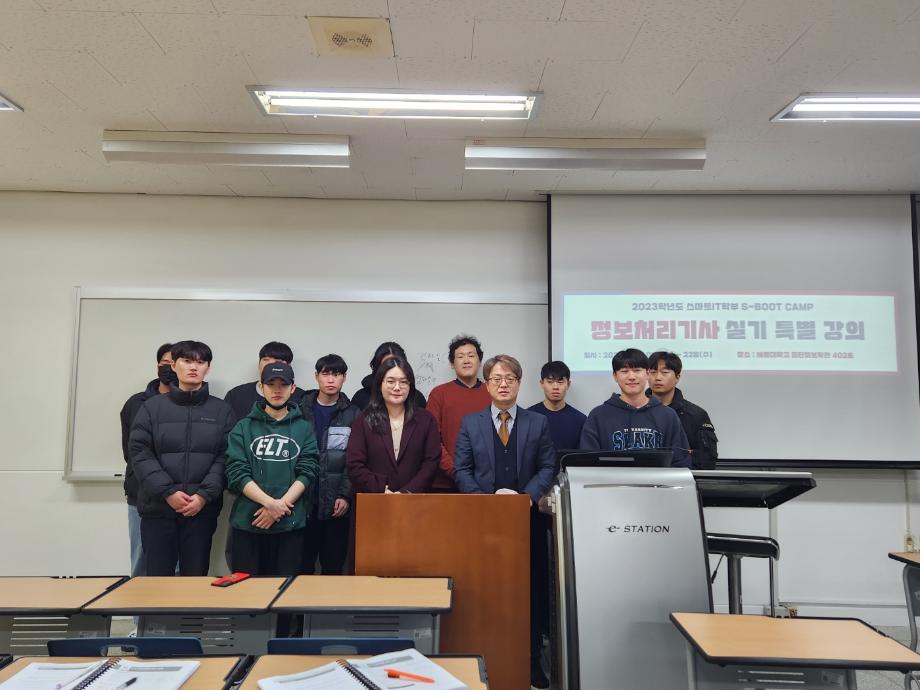 본문 시작 홈으로 SMIT 소식 SMIT 소개 SMIT 교육 SMIT 취업 SMIT 소식 SMIT 입학 홈페이지가이드 갤러리 공지사항 갤러리 경진대회 동아리 갤러리 페이스북 트위터 프린트 S-Boot Camp 정보처리기사 실기 특강 스마트IT학부 3854 2023-11-29 스마트IT학부는 4학년 재학생들을 대상으로 첨단정보학관 402호에서 2023.11.01(수), 08(수), 15(수), 22(수) 총 4주 동안 S-Boot Camp 정보처리기사 실기 특강을 시행했습니다. S-Boot Camp 정보처리기 실기 특강으로 학생들의 직무 역량을 강화할 수 있는 유익한 시간이었습니다. 목록 이전📌 잊지 말고! 수시 최초합격자 등록하자!! 다음 📌 2024학년도 세명대 정시 모집요강 안내 📌 담당부서 : 스마트IT학부 담당자 : - 연락처 : 043-649-1275 최종수정일 : 2024-10-26 만족도조사 만족도 조사 이 페이지에서 제공하는 정보에 대하여 만족하시나요? 매우만족 만족 보통 불만족 매우불만족