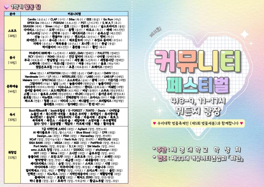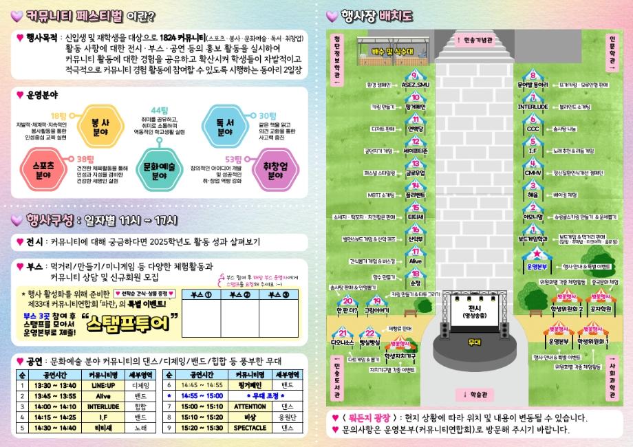 본문 시작 홈으로 SMIT 소식 SMIT 소개 SMIT 교육 SMIT 취업 SMIT 소식 SMIT 입학 홈페이지가이드 갤러리 공지사항 갤러리 경진대회 동아리 갤러리 페이스북 트위터 프린트 🎪 <제11회 커뮤니티 페스티벌> 시행 안내 🎪 스마트IT학부 30 2026-04-06 🎪 <제11회 커뮤니티 페스티벌> 시행 안내 🎪 목록 이전AI융합대학으로 명칭 변경! 다음 제 5회 세명대학교 벚꽃축제 '벚꽃세봄' 개최 안내 담당부서 : 스마트IT학부 담당자 : - 연락처 : 043-649-1275 최종수정일 : 2024-10-26 만족도조사 만족도 조사 이 페이지에서 제공하는 정보에 대하여 만족하시나요? 매우만족 만족 보통 불만족 매우불만족