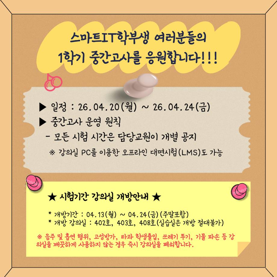 본문 시작 홈으로 SMIT 소식 SMIT 소개 SMIT 교육 SMIT 취업 SMIT 소식 SMIT 입학 홈페이지가이드 갤러리 공지사항 갤러리 경진대회 동아리 갤러리 페이스북 트위터 프린트 세명대알림_4월(1) : 2026학년도 1학기 중간고사 스마트IT학부 22 2026-04-14 세명대알림_4월(1) : 2026학년도 1학기 중간고사 목록 이전제 5회 세명대학교 벚꽃축제 '벚꽃세봄' 개최 안내 다음 세명대알림_4월(2) : 세명대학교 벚꽃 담당부서 : 스마트IT학부 담당자 : - 연락처 : 043-649-1275 최종수정일 : 2024-10-26 만족도조사 만족도 조사 이 페이지에서 제공하는 정보에 대하여 만족하시나요? 매우만족 만족 보통 불만족 매우불만족