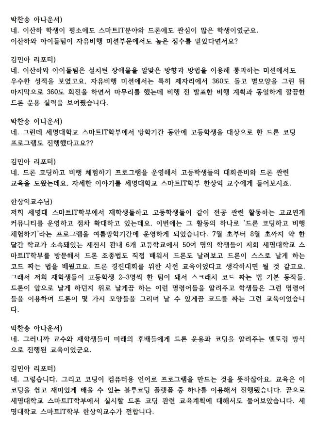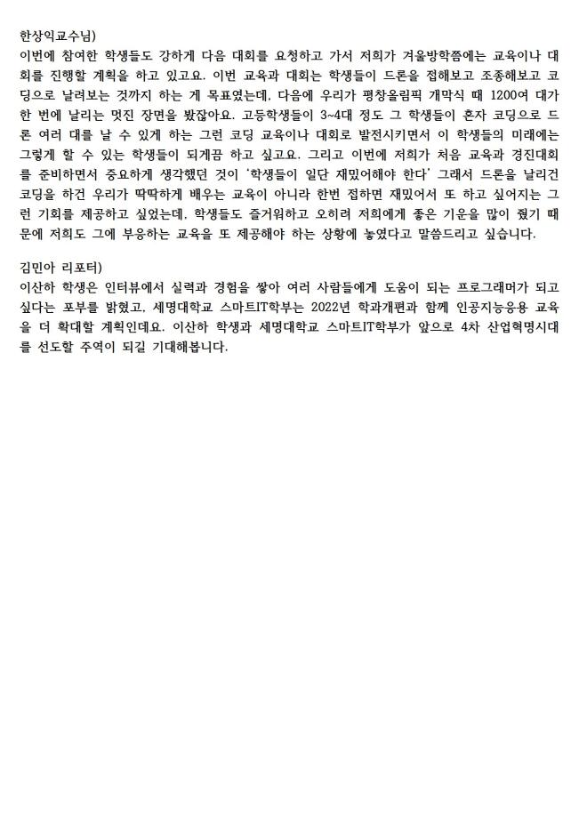 본문 시작 홈으로 SMIT 소식 SMIT 소개 SMIT 교육 SMIT 취업 SMIT 소식 SMIT 입학 홈페이지가이드 갤러리 공지사항 갤러리 경진대회 동아리 갤러리 페이스북 트위터 프린트 21.08.30(월) SM 스마트 드론 레이싱 경진대회 관련 라디오 출연 스마트IT학부 3801 2021-09-23 지난 8월19일(목)에 진행한 "SM 스마트 드론 레이싱 경진대회"와 관련하여 최우수상을 수상한 충주상업고 학생과 스마트IT학부 한상익교수님이 출연하여 수상소감대회 및 준비과정과 진행 방식등을 설명하였다. 목록 이전2021. SM 스마트 드론 레이싱 경진대회 기사 다음 2021.09.03(금) 스마트IT학부 한상익교수님 라디오 출연 담당부서 : 스마트IT학부 담당자 : - 연락처 : 043-649-1275 최종수정일 : 2024-10-26 만족도조사 만족도 조사 이 페이지에서 제공하는 정보에 대하여 만족하시나요? 매우만족 만족 보통 불만족 매우불만족