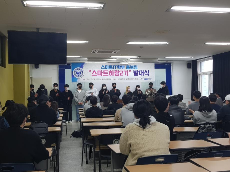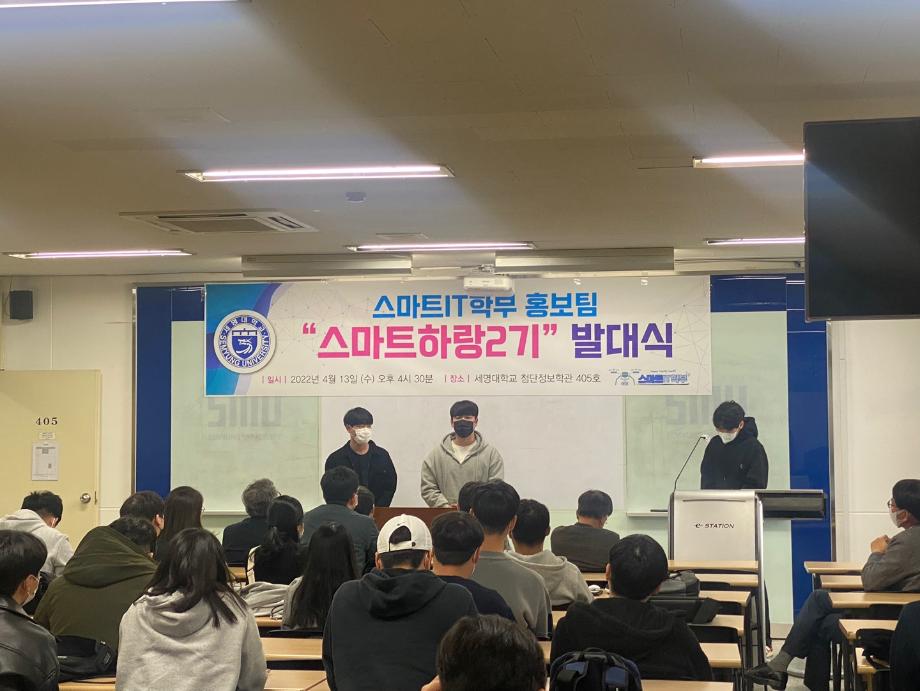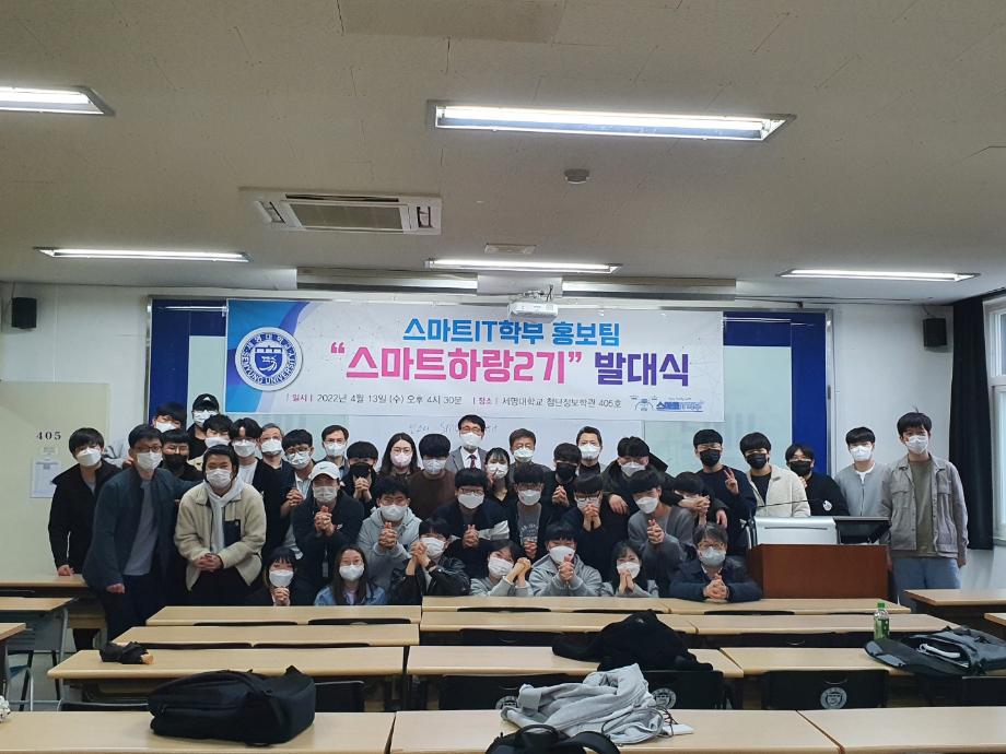 본문 시작 홈으로 SMIT 소식 SMIT 소개 SMIT 교육 SMIT 취업 SMIT 소식 SMIT 입학 홈페이지가이드 갤러리 공지사항 갤러리 경진대회 동아리 갤러리 페이스북 트위터 프린트 스마트IT학부 홍보팀 '스마트하랑2기' 발대식 스마트IT학부 2664 2022-04-13 4월13일(수) 오후 4시30분에 첨단정보학관과 벚꽃이 화사한 교정에서 1학년 43명과 학부교수님, 학회 임원들이 참가해서, 홍보팀 ‘2기 스마트하랑’ 발대식과 함께 2022년도 학부 홍보 활동을 본격적으로 시작하였다. 스마트하랑은 ‘스마트’와 [함께 높이 날다] 뜻인 ‘하랑’의 합성어로, 세명대 스마트IT 학부를 세상에 널리 알리기 위한 사명감으로, 작년부터 학부 SNS 중심으로 홍보활동을 진행하고 있다. 목록 이전제천고 자연과학 아카데미 1차 진행 다음 스마트IT학부 제천중학교 '가보자구' 과학축제 행사 참여 담당부서 : 스마트IT학부 담당자 : - 연락처 : 043-649-1275 최종수정일 : 2024-10-26 만족도조사 만족도 조사 이 페이지에서 제공하는 정보에 대하여 만족하시나요? 매우만족 만족 보통 불만족 매우불만족
