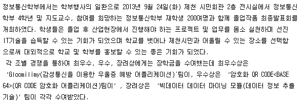 본문 시작 홈으로 SMIT 소식 SMIT 소개 SMIT 교육 SMIT 취업 SMIT 소식 SMIT 입학 홈페이지가이드 갤러리 공지사항 갤러리 경진대회 동아리 갤러리 페이스북 트위터 프린트 정보통신학부 연합 MT 개최 오선진 7801 2013-10-11 단양 대명 리조트 목록 이전2013학년도 졸업작품전 개최 다음 2013-2학기 졸업생 초청 학술특강 개최 담당부서 : 스마트IT학부 담당자 : - 연락처 : 043-649-1275 최종수정일 : 2024-10-26 만족도조사 만족도 조사 이 페이지에서 제공하는 정보에 대하여 만족하시나요? 매우만족 만족 보통 불만족 매우불만족