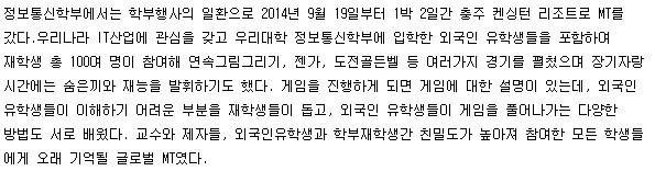 본문 시작 홈으로 SMIT 소식 SMIT 소개 SMIT 교육 SMIT 취업 SMIT 소식 SMIT 입학 홈페이지가이드 갤러리 공지사항 갤러리 경진대회 동아리 갤러리 페이스북 트위터 프린트 정보통신학부 졸업작품 전시회 및 학부 특성화 사업 설명회 개최 오선진 8098 2014-10-07 정보통신학부 졸업작품 전시회 및 학부 특성화 사업 설명회 개최 목록 이전정보통신학부, 글로벌 MT 개최 다음 한방·의료 ICT 융합 인재 양성 사업단, 오송 국제 바이오 엑스포 견학 담당부서 : 스마트IT학부 담당자 : - 연락처 : 043-649-1275 최종수정일 : 2024-10-26 만족도조사 만족도 조사 이 페이지에서 제공하는 정보에 대하여 만족하시나요? 매우만족 만족 보통 불만족 매우불만족