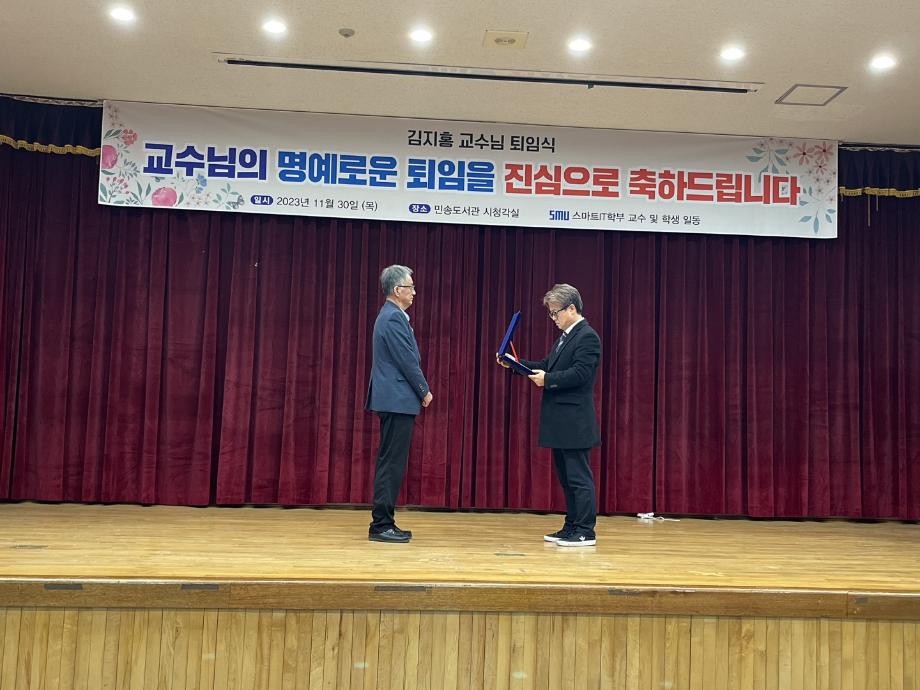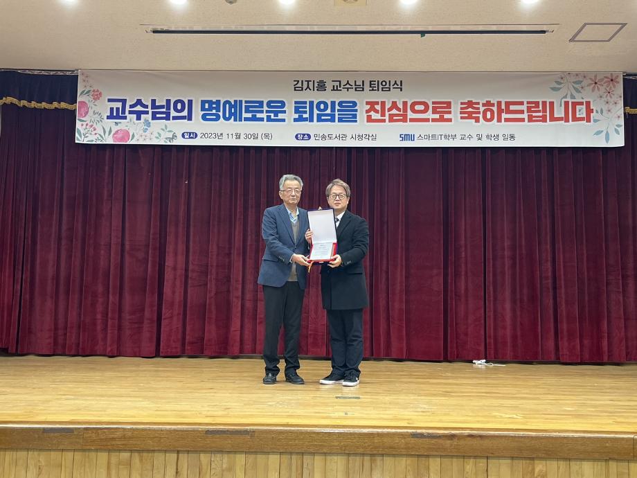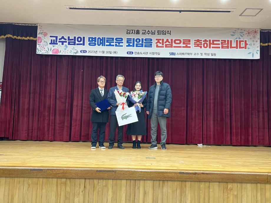 본문 시작 홈으로 SMIT 소식 SMIT 소개 SMIT 교육 SMIT 취업 SMIT 소식 SMIT 입학 홈페이지가이드 갤러리 공지사항 갤러리 경진대회 동아리 갤러리 페이스북 트위터 프린트 김지홍 교수님 퇴임식 진행 스마트IT학부 4058 2023-12-04 2023.11.30(목)에 스마트IT학부 김지홍 교수님의 명예로운 퇴임식이 시행 되었다. 본 행사는 <캡스톤 디자인 중간 발표회> 행사가 끝난 후 진행 되었다. 학생들의 영상편지와 재직 기념패 증정 및 꽃다발 증정으로 이루어졌다. 김지홍 교수님의 퇴임사와 권혁민 교수님의 축하 인사말이 있었다. 스마트IT학부 재학생들과 교수님들은 진심으로 김지홍 교수님의 명예로운 퇴임을 축하 하였다. 목록 이전스마트IT학부 캡스톤디자인 중간발표회 시행 다음 2023학년도 총장표창 수상 ! 담당부서 : 스마트IT학부 담당자 : - 연락처 : 043-649-1275 최종수정일 : 2024-10-26 만족도조사 만족도 조사 이 페이지에서 제공하는 정보에 대하여 만족하시나요? 매우만족 만족 보통 불만족 매우불만족