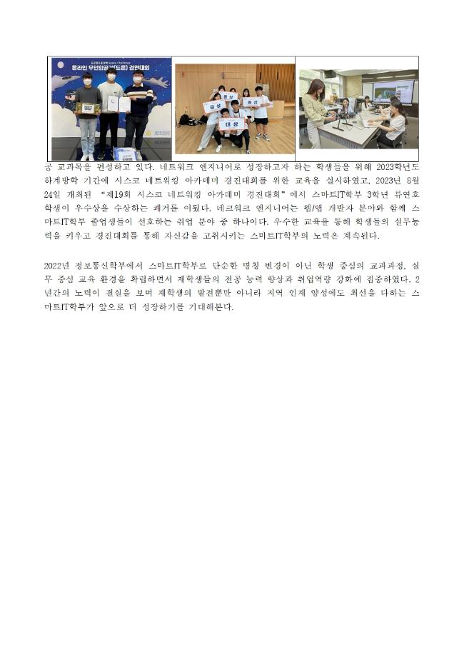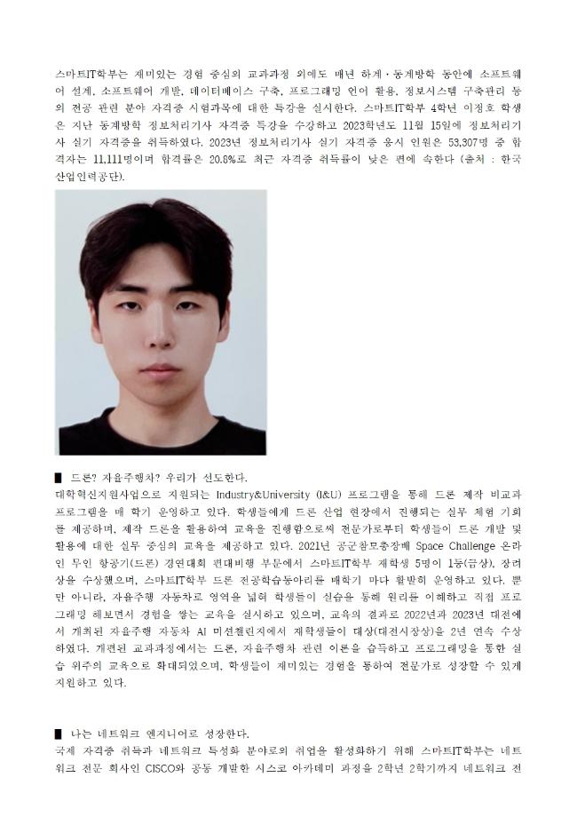 본문 시작 홈으로 SMIT 소식 SMIT 소개 SMIT 교육 SMIT 취업 SMIT 소식 SMIT 입학 홈페이지가이드 갤러리 공지사항 갤러리 경진대회 동아리 갤러리 페이스북 트위터 프린트 실무경험 ? 자격증? 취업 All in 세명대학교 스마트IT학부 스마트IT학부 2910 2024-01-04 안녕하세요. 세명대학교 스마트IT학부입니다. 스마트IT학부 보도자료 내용입니다. 실무경험? 자격증? 취업? All in 세명대학교 스마트IT학부! -실무능력을 중심으로 교과과정 개편 -자격증? 어려워도 우리는 자신있다 ! -드론? 자율주행차? 우리가 선도한다 -나는 네트워크 엔지니어로 성장한다. 목록 이전세명대학교 스마트IT학부는 이런 활동을 한다 ❗ 다음 동계방학 특별활동 “정보처리기사 자격증 특강” 실시!📚 담당부서 : 스마트IT학부 담당자 : - 연락처 : 043-649-1275 최종수정일 : 2024-10-26 만족도조사 만족도 조사 이 페이지에서 제공하는 정보에 대하여 만족하시나요? 매우만족 만족 보통 불만족 매우불만족