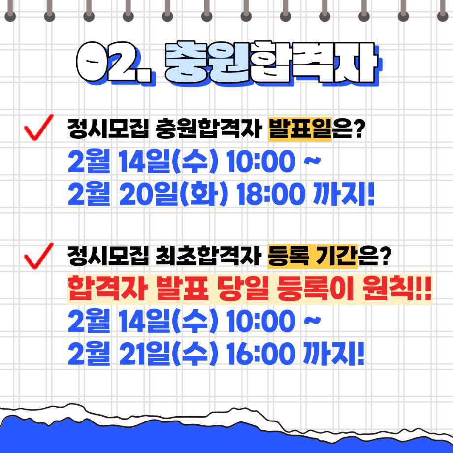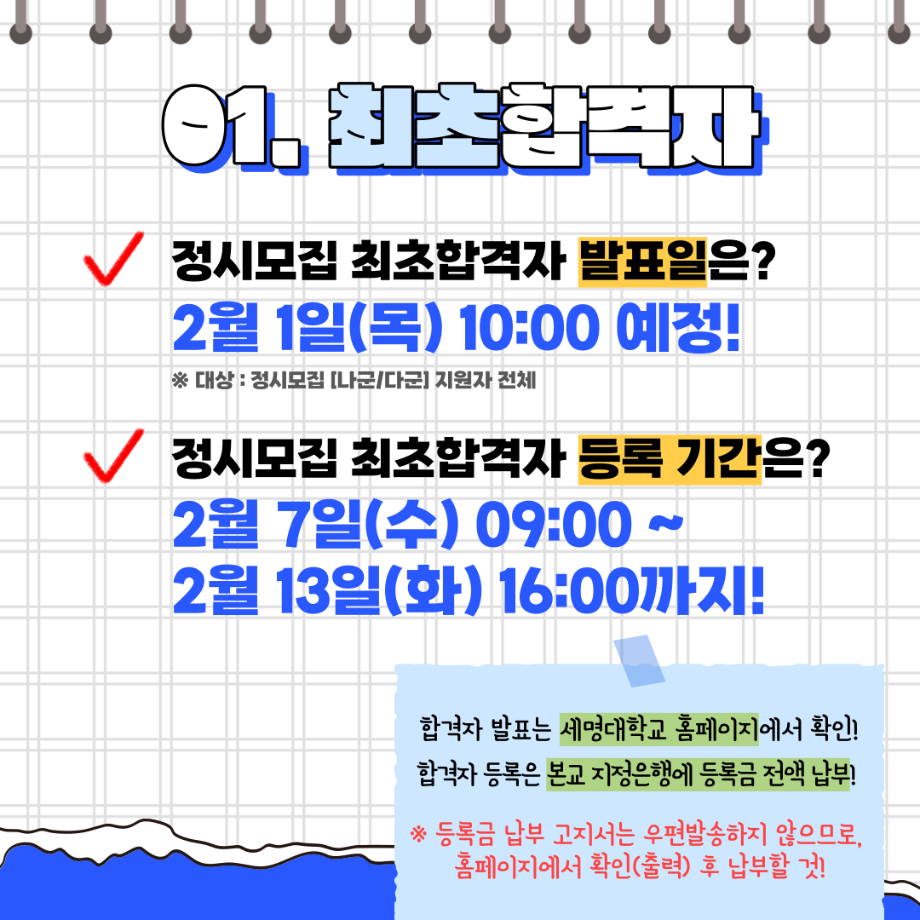 본문 시작 홈으로 SMIT 소식 SMIT 소개 SMIT 교육 SMIT 취업 SMIT 소식 SMIT 입학 홈페이지가이드 갤러리 공지사항 갤러리 경진대회 동아리 갤러리 페이스북 트위터 프린트 세명대학교 2024학년도 정시 합격자 발표 및 등록 일정 총정리💡 스마트IT학부 2812 2024-01-25 세명대학교 2024학년도 정시 합격자 발표 및 등록 일정 총정리💡 안녕하세요. 세명대학교 스마트IT학부입니다. 2024학년도 정시 합격자 발표 및 등록 일정 총정리입니다 😍 정시 발표 및 등록 일정 꼭 확인 하셔서 차질 없으시길 바랍니다. 😊 3월에 세명대학교 스마트IT학부에서 꼭 만나요🥰 목록 이전동계방학 특별활동 “정보처리기사 자격증 특강” 실시!📚 다음 2024학년도 꿈설계학기 라인업 ✨ 담당부서 : 스마트IT학부 담당자 : - 연락처 : 043-649-1275 최종수정일 : 2024-10-26 만족도조사 만족도 조사 이 페이지에서 제공하는 정보에 대하여 만족하시나요? 매우만족 만족 보통 불만족 매우불만족