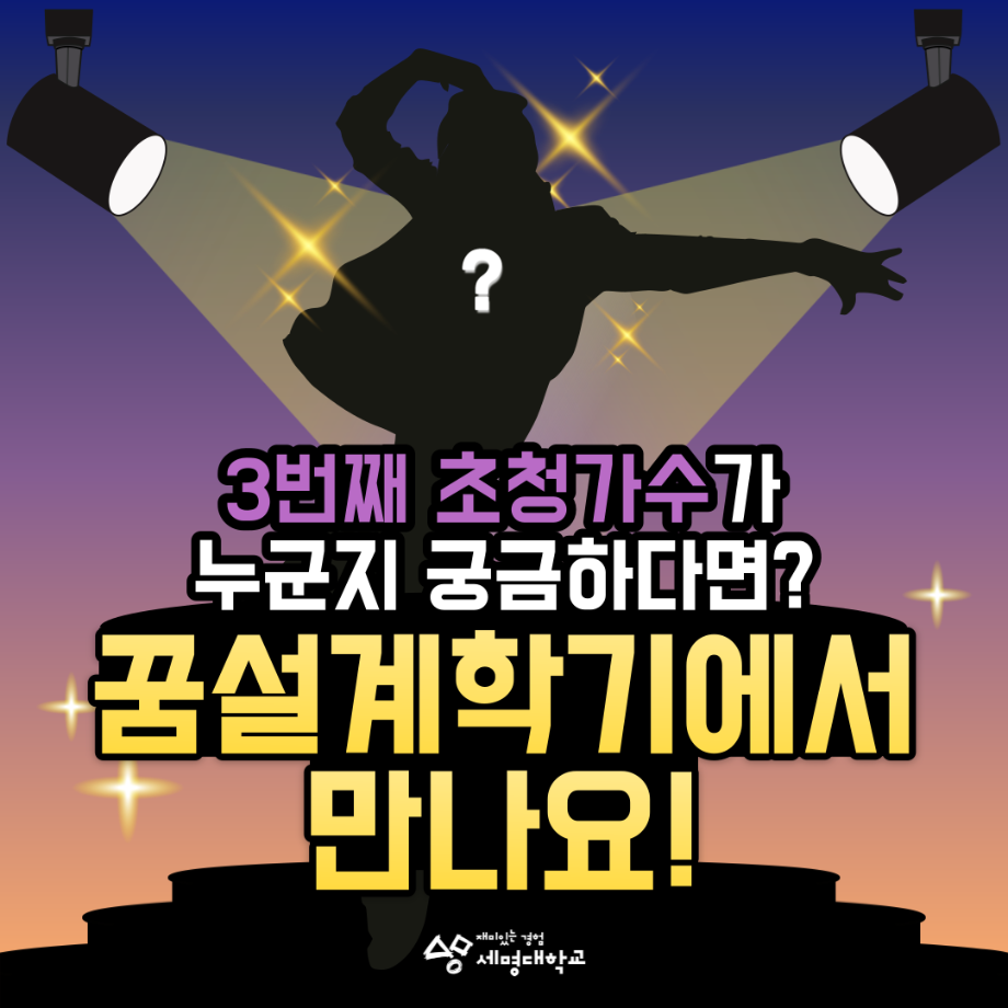 본문 시작 홈으로 SMIT 소식 SMIT 소개 SMIT 교육 SMIT 취업 SMIT 소식 SMIT 입학 홈페이지가이드 갤러리 공지사항 갤러리 경진대회 동아리 갤러리 페이스북 트위터 프린트 2024학년도 꿈설계학기 라인업 ✨ 스마트IT학부 3004 2024-02-01 세명대 2024 신입생 꿈설계학기(OT) 초청가수 라인업이 유출됐다?! 세명대학교의 2월에 절대 빠질 수 없는 행사, ✨꿈설계학기!✨ 2024 꿈설계학기 초청가수 라인업이 유출되었다는데...?!😮 🎵 첫번째 가수 힌트! 나에게만~ 준비된 OO같아~ 🎵 두번째 가수 힌트! 쇼미더머니 출신 여성 래퍼! 🎵 그리고 세번째 가수는 과연 누구일까요?🤔 세 번째 가수가 궁금하다면? 2월 19일! 꿈설계학기에서 만나요😎 목록 이전세명대학교 2024학년도 정시 합격자 발표 및 등록 일정 총정리💡 다음 스마트IT학부 전기 학위수여식 진행 ! 담당부서 : 스마트IT학부 담당자 : - 연락처 : 043-649-1275 최종수정일 : 2024-10-26 만족도조사 만족도 조사 이 페이지에서 제공하는 정보에 대하여 만족하시나요? 매우만족 만족 보통 불만족 매우불만족