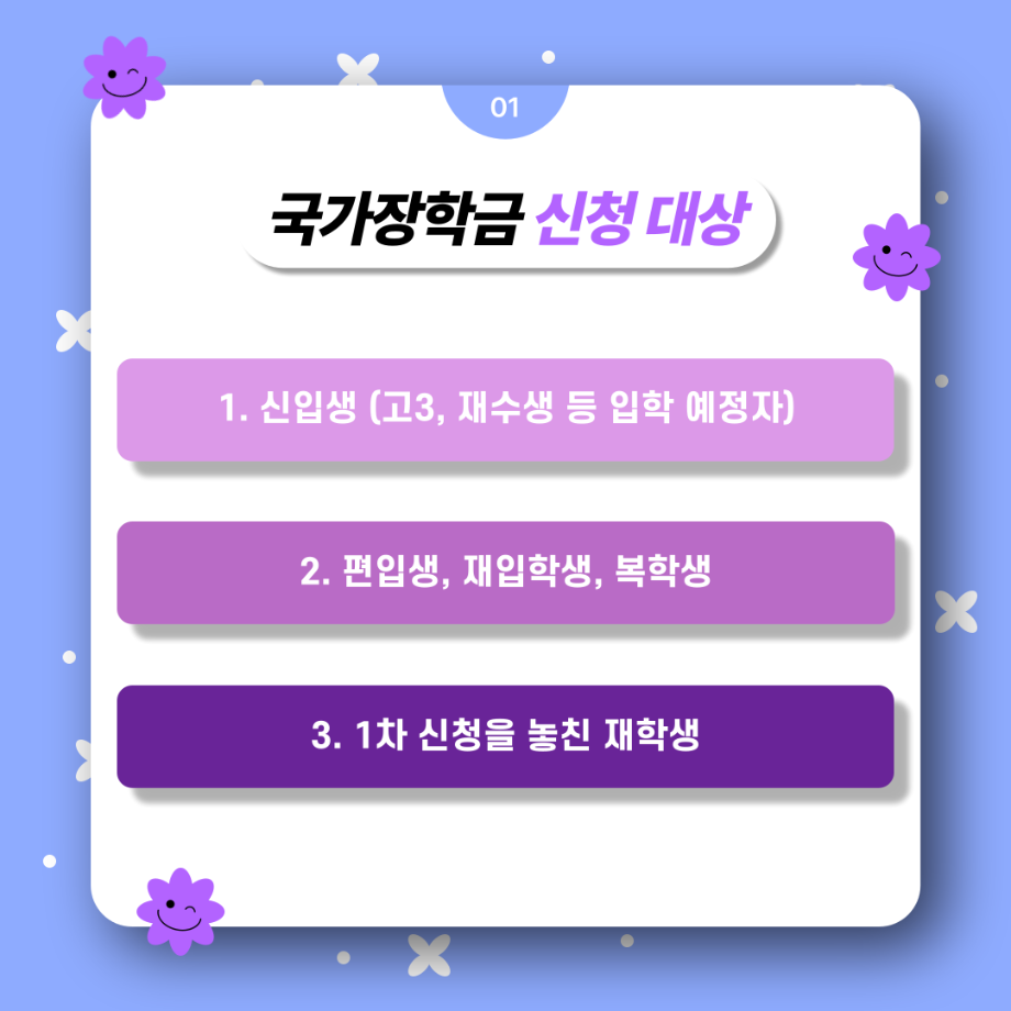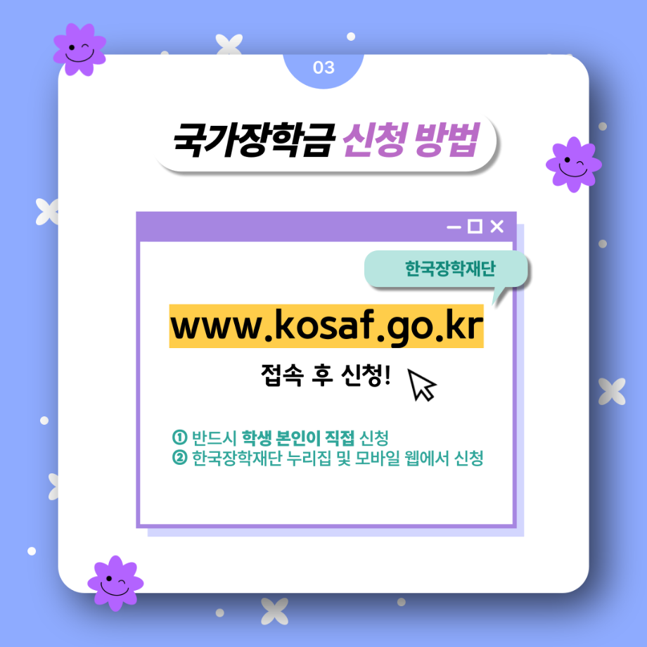 본문 시작 홈으로 SMIT 소식 SMIT 소개 SMIT 교육 SMIT 취업 SMIT 소식 SMIT 입학 홈페이지가이드 갤러리 공지사항 갤러리 경진대회 동아리 갤러리 페이스북 트위터 프린트 여러분! 국가장학금 2차 신청하세요! 스마트IT학부 2739 2024-02-23 여러분! 국가장학금 2차 신청하세요! ✔ 내가 세명대학교 신입생이라면! ✔ 내가 편입생, 재입학생, 복학생이라면! ✔ 내가 1차 신청을 놓쳤다면! 📌 24년 2월 1일(목) 09:00부터 3월 24일(목) 18:00까지 ✨ 한국장학재단 사이트에서 신청하세요! 목록 이전2024년도 꿈설계학기 2일차 다음 2024학년도 추가모집 주요사항 담당부서 : 스마트IT학부 담당자 : - 연락처 : 043-649-1275 최종수정일 : 2024-10-26 만족도조사 만족도 조사 이 페이지에서 제공하는 정보에 대하여 만족하시나요? 매우만족 만족 보통 불만족 매우불만족