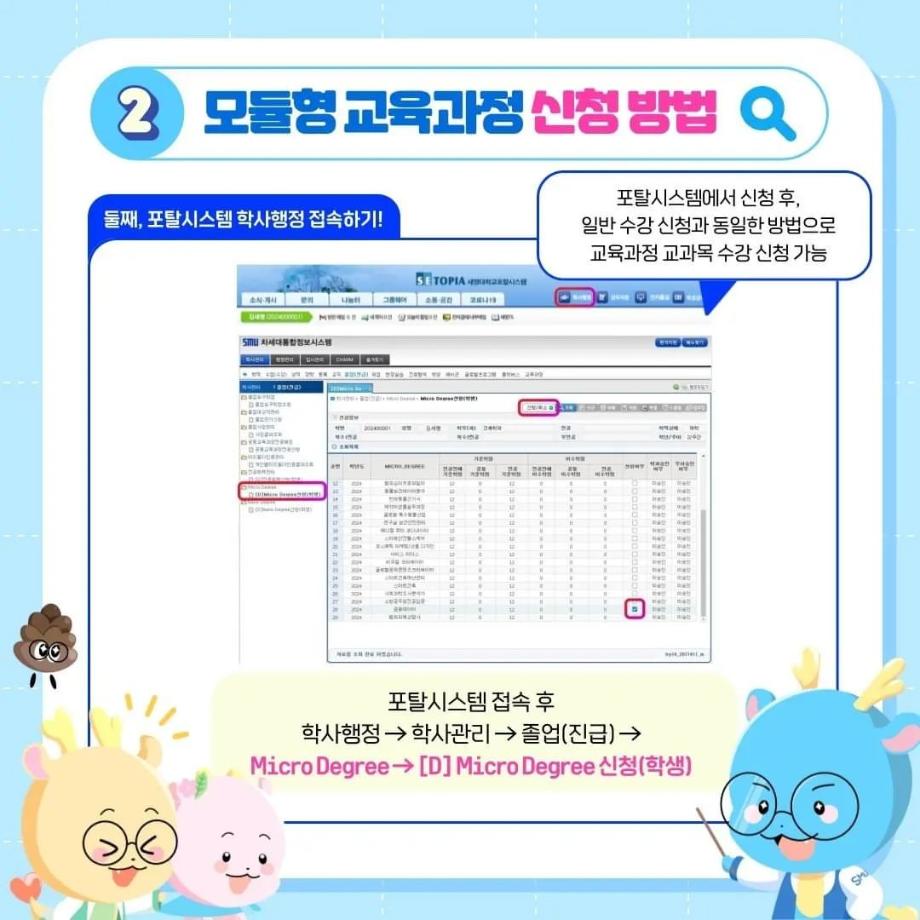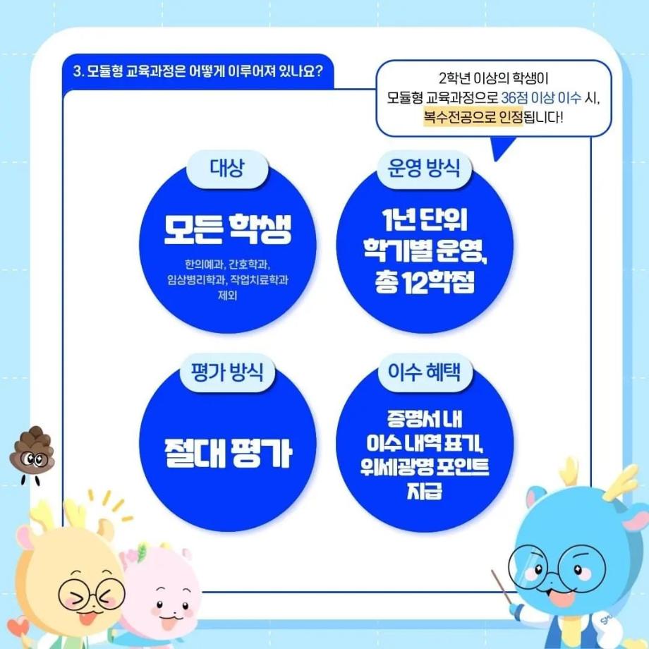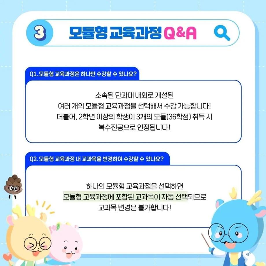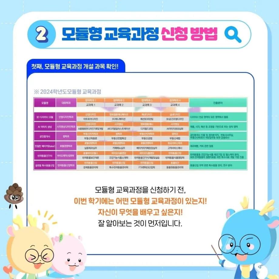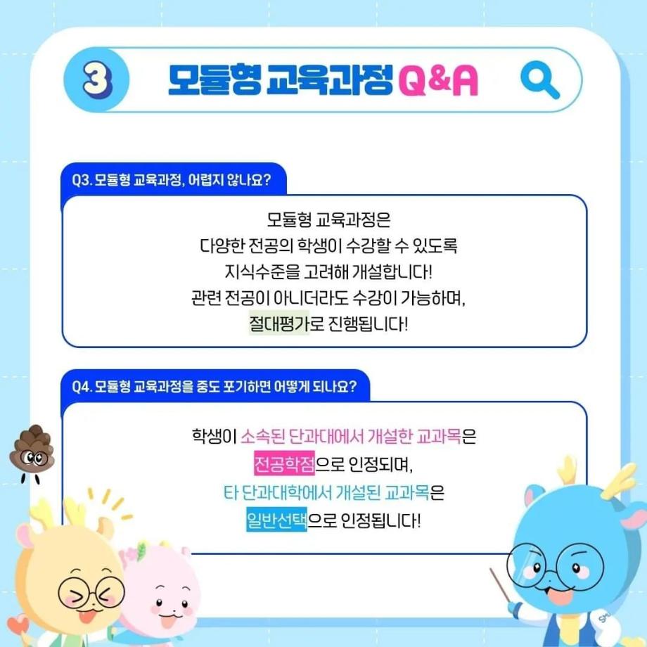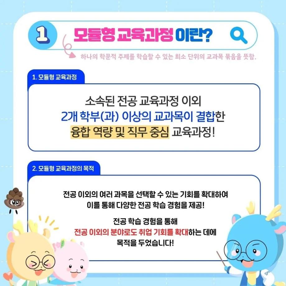 본문 시작 홈으로 SMIT 소식 SMIT 소개 SMIT 교육 SMIT 취업 SMIT 소식 SMIT 입학 홈페이지가이드 갤러리 공지사항 갤러리 경진대회 동아리 갤러리 페이스북 트위터 프린트 ✨모듈형 교육과정✨ 안내 스마트IT학부 2736 2024-03-29 융합인재를 위한 세명대의 새로운 시도, ✨모듈형 교육과정✨ 안내 2024년부터 시행되는 모듈형 교육과정! 2개 학부(과) 이상의 교과목이 결합한 ✔융합 역량 및 직무 중심 교육과정✔으로, 다양한 전공 학습 경험 제공을 통해 전공 이외의 분야로 ✨취업 기회를 확대✨할 수 있습니다! 모듈형 교육과정이 더 궁금하다면? 📞 043) 649-1131, 1135 (세명대학교 교무연구처 학사관리팀) 목록 이전2024학년도 신입생 환영회😀 다음 제천시 전입 장학금 안내 ! 담당부서 : 스마트IT학부 담당자 : - 연락처 : 043-649-1275 최종수정일 : 2024-10-26 만족도조사 만족도 조사 이 페이지에서 제공하는 정보에 대하여 만족하시나요? 매우만족 만족 보통 불만족 매우불만족