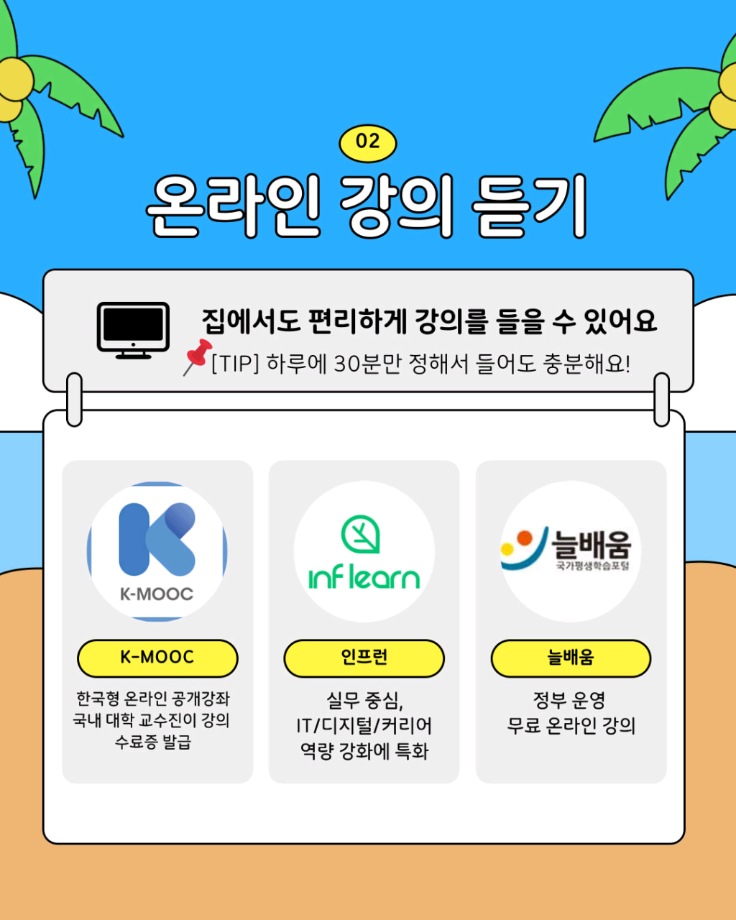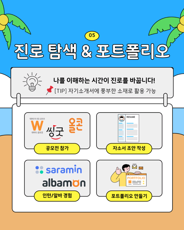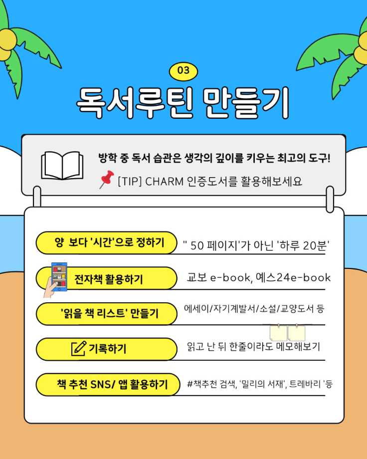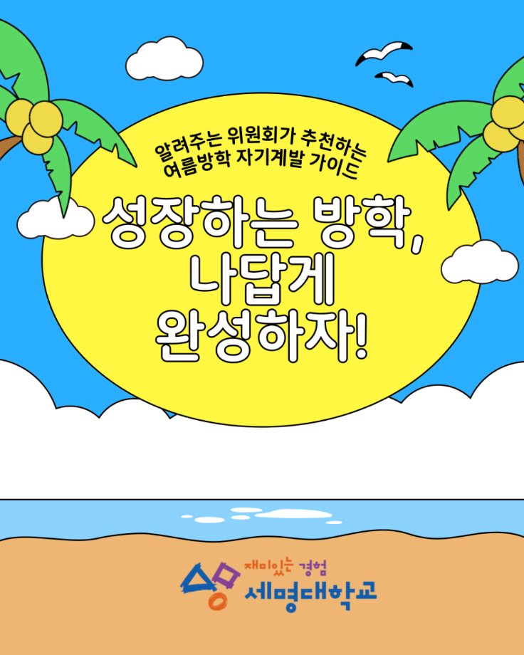 본문 시작 홈으로 SMIT 소식 SMIT 소개 SMIT 교육 SMIT 취업 SMIT 소식 SMIT 입학 홈페이지가이드 갤러리 공지사항 갤러리 경진대회 동아리 갤러리 페이스북 트위터 프린트 🌞여름방학 자기계발 가이드🏖️ 스마트IT학부 1588 2025-07-11 알려주는 위원회가 추천하는 🌞여름방학 자기계발 가이드🏖️ 📢 이번 방학, 그냥 흘려보낼 순 없죠! 자격증, 봉사, 독서까지 🌿 나만의 방식으로 성장하는 여름방학 시작해봐요! 알려주는 위원회가 추천하는 자기계발 꿀팁, 카드뉴스로 확인해보세요! ☀️ 출처 : 세명대학교 인스타그램 #세명대 #세명대학교 #대학 #방학자기계발 #성장하는방학 #자격증준비 #무료강의 #독서루틴 #봉사활동 #여름방학 #여름 목록 이전스마트IT학부 기말고사 간식나눔 이벤트👊 다음 CHARM인증제를 알려줘!⭐️ 담당부서 : 스마트IT학부 담당자 : - 연락처 : 043-649-1275 최종수정일 : 2024-10-26 만족도조사 만족도 조사 이 페이지에서 제공하는 정보에 대하여 만족하시나요? 매우만족 만족 보통 불만족 매우불만족