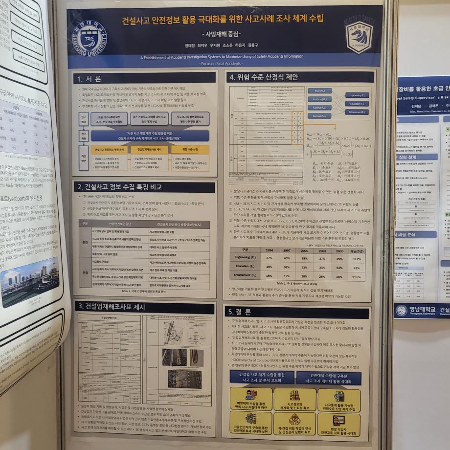 본문 시작 홈으로 커뮤니티 학과소개 진로 및 취업 교수소개 학과과정 커뮤니티 홈페이지가이드 포토갤러리 학과공지 학사일정 포토갤러리 학생회 학과영상 보건안전학과 인스타 보건안전학과 블로그 포토갤러리 페이스북 트위터 프린트 2023년 한국건설관리학회 주최 "정기학술발표대회"참가하여 장려상 수상 (학생 : 장태정(4학년), 최지우(4학년), 우지원(4학년), 조소은(4학년), 하은지(3학년) - 지도교수 : 김용구) 보건안전학과 3434 2023-11-10 2023년 한국건설관리학회 주최 "정기학술발표대회"에 참가 "전국 대학생 학술발표대회 부문에서"에서 장려상 수상 - 학회명 : 한국건설관리학회 - 일시 : 2023 11.3(금), 강원도 고성 소노캄 델피노 - 논문명 : 건설사고 안전정보 활용 극대화를 위한 사고사례 조사체계 수립(사망재해 중심) - 연구참여자 : 장태정(4학년), 최지우(4학년), 우지원(4학년), 조소은(4학년), 하은지(3학년) - 지도교수 : 김용구 목록 이전2023년도 (사)대한설비관리학회 제28회 학술발표대회 세명대 보건안전학과 최우수상(2등) 수상 다음 제4회 보건바이오대학 charm경험발표회 담당부서 : 보건안전학과 담당자 : - 연락처 : 043-649-1777 최종수정일 : 2024-10-26 만족도조사 만족도 조사 이 페이지에서 제공하는 정보에 대하여 만족하시나요? 매우만족 만족 보통 불만족 매우불만족