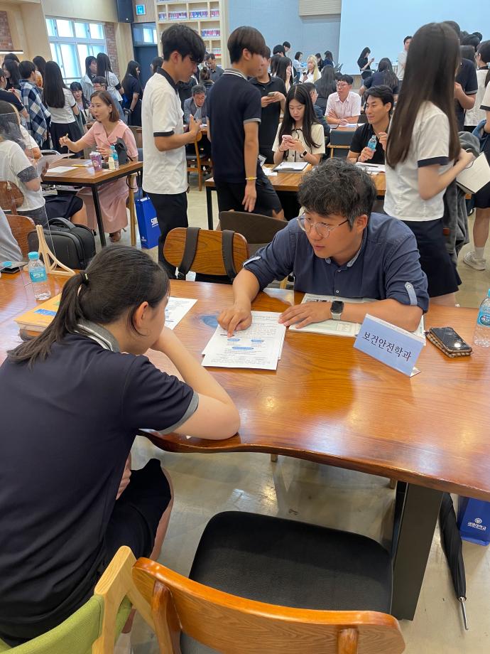 세명고 학생들이 자유롭게 입시상담 부스에 방문하여 보건안전학과에 대한 정보, 입시 등에 대하여 상담 하였습니다.