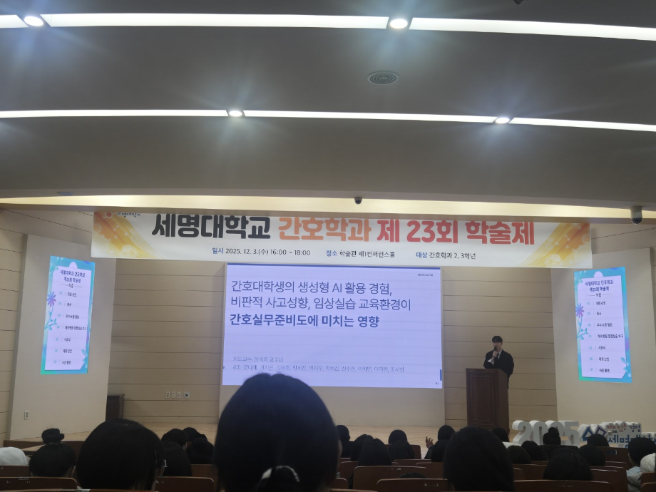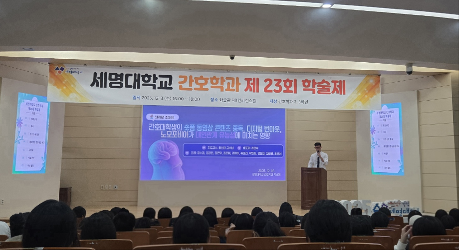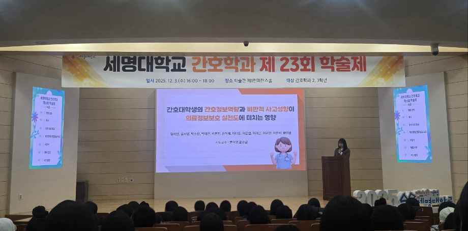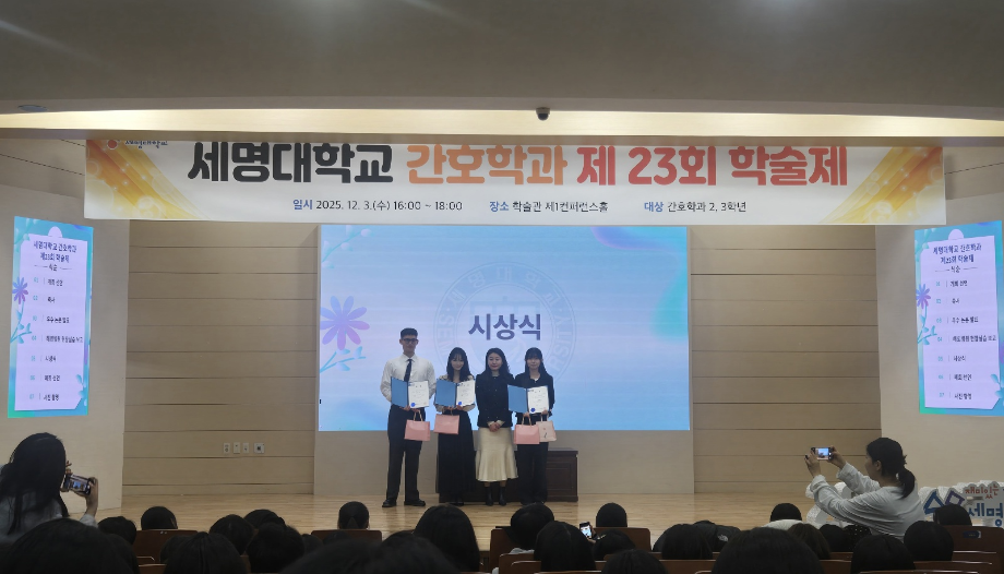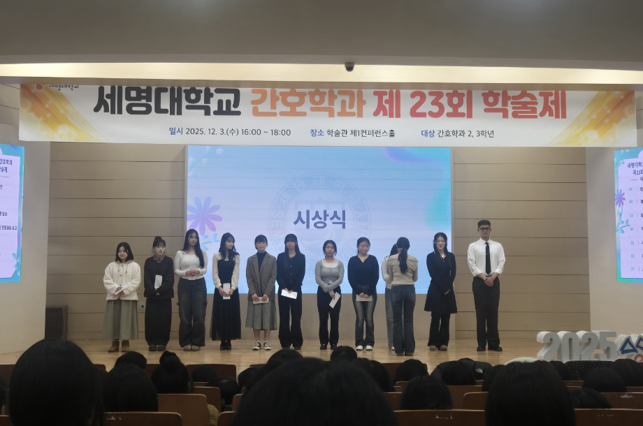 본문 시작 홈으로 커뮤니티 학과소개 교수소개 교육과정 학과소식 학과특성화 사업 커뮤니티 홈페이지가이드 포토갤러리 학사일정 포토갤러리 학생회 학과동아리 학과 취업정보 동창회 학과운영개선의견 발전기금 포토갤러리 페이스북 트위터 프린트 제 23회 간호학과 학술제 간호학과 2061 2025-12-08 12/3 진행된 📝 2024 학술제 발표와 ✈ 해외 인턴십 경험 공유 후기가 학과 블로그에 업로드되었습니다. 발표 현장과 생생한 경험담이 궁금하다면 아래 링크를 확인해주세요 👇 🔗 링크 https://blog.naver.com/nursing_smu_official/224099825798 목록 이전📍 ‘임상실습 안전사고 ZERO를 위하여’ 특강 다음 세명대학교 간호학과 제66회 간호사 국가시험 임장지도 실시 담당부서 : 간호학과 담당자 : - 연락처 : 043-649-1357 최종수정일 : 2024-10-26 만족도조사 만족도 조사 이 페이지에서 제공하는 정보에 대하여 만족하시나요? 매우만족 만족 보통 불만족 매우불만족