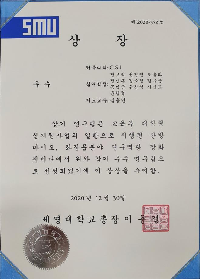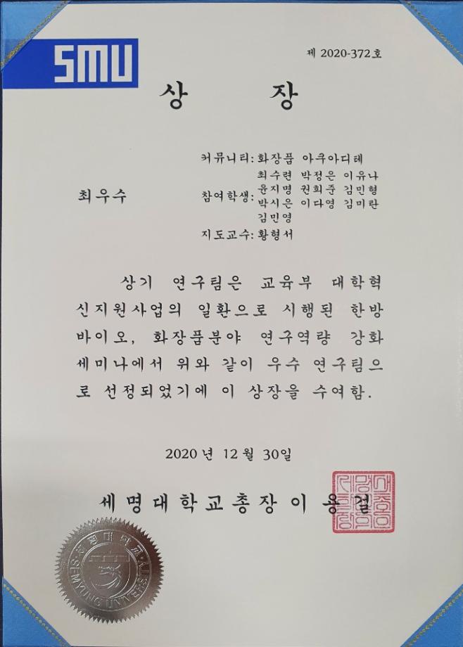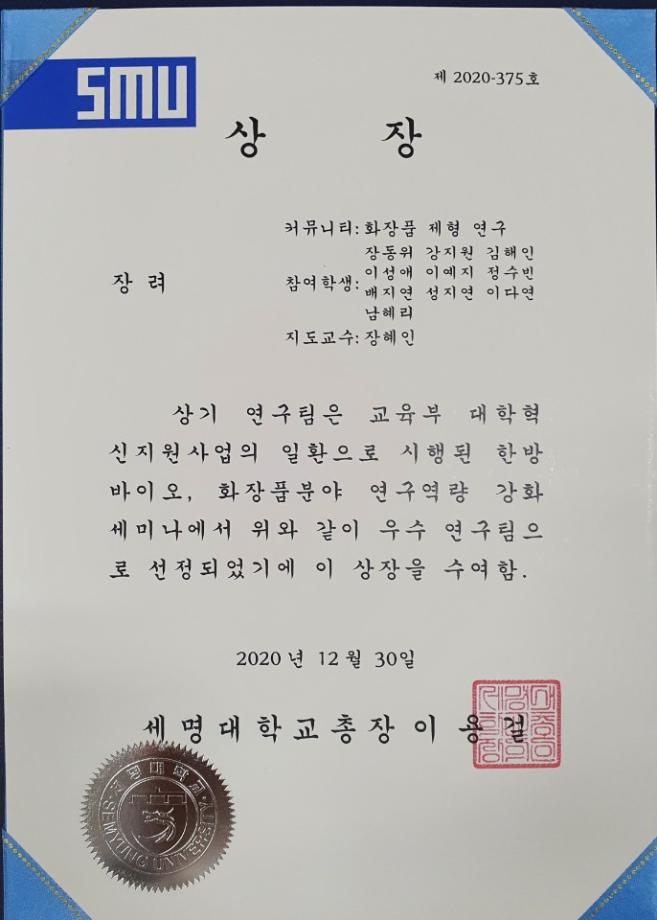 우리 화장품뷰티생명공학부에서는 총 5개의 커뮤니티가 참여하여 연간 연구수행내용, 포스터 발표, 논문게재 내용 등 연구 성과물을 공개하였습니다. COVID-19로 연구 활동에 많은 어려움이 있었지만, 우수한 성과로 상장(최우수 1팀, 우수 2팀, 장려 3팀)을 수여 받았습니다.