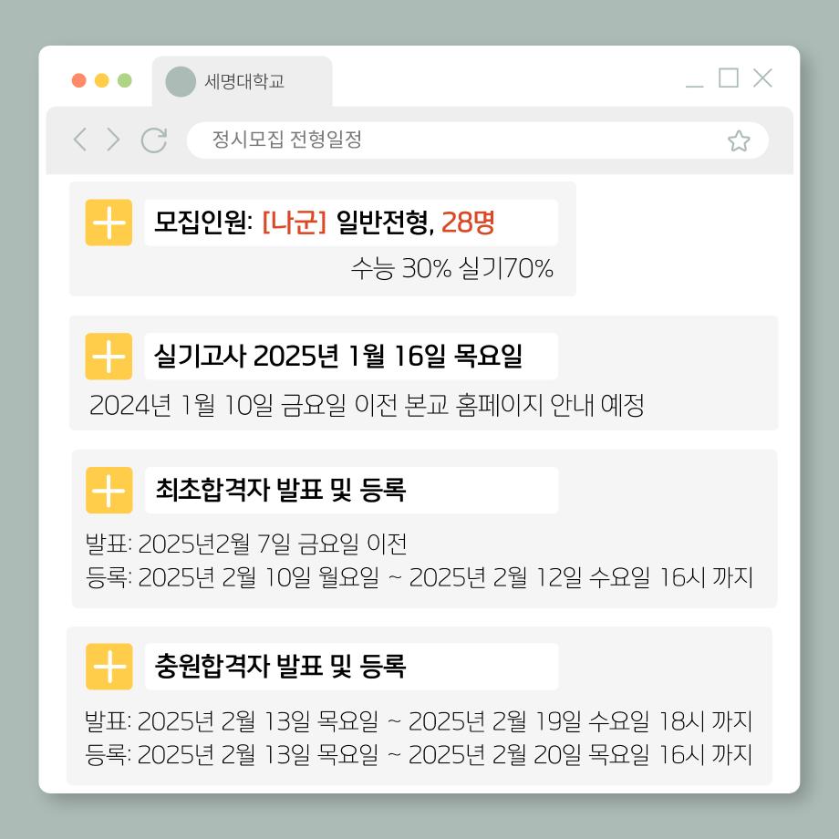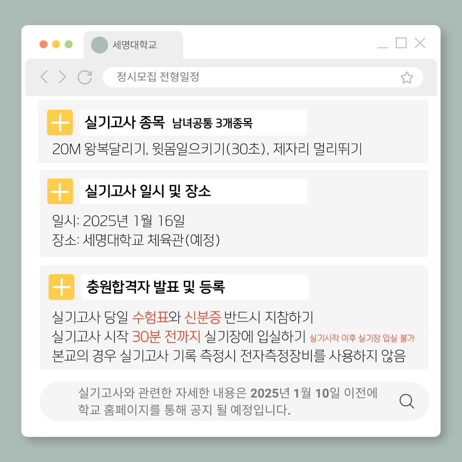 본문 시작 홈으로 커뮤니티SNS 학과소개 진로취업사례 입학안내 교육과정 커뮤니티SNS 홈페이지가이드 학과행사갤러리 학과공지 열린정보SNS 학과동아리 학과행사갤러리 학과MOU 학생회조직도 학과연혁 동문회조직도 학과행사갤러리 페이스북 트위터 프린트 2025학년도 정시 실기고사 생활체육학과 3262 2025-01-09 2025학년도 세명대학교 생활체육학과 정시모집 전형일정 및 실기고사 안내입니다 ! 목록 이전2024학년도 동계스포츠 다음 2025학년도 정시 실기고사 시행 담당부서 : 생활체육학과 담당자 : - 연락처 : 043-469-1289 최종수정일 : 2024-10-26 만족도조사 만족도 조사 이 페이지에서 제공하는 정보에 대하여 만족하시나요? 매우만족 만족 보통 불만족 매우불만족
