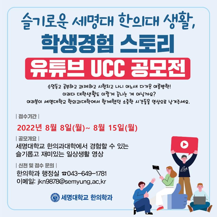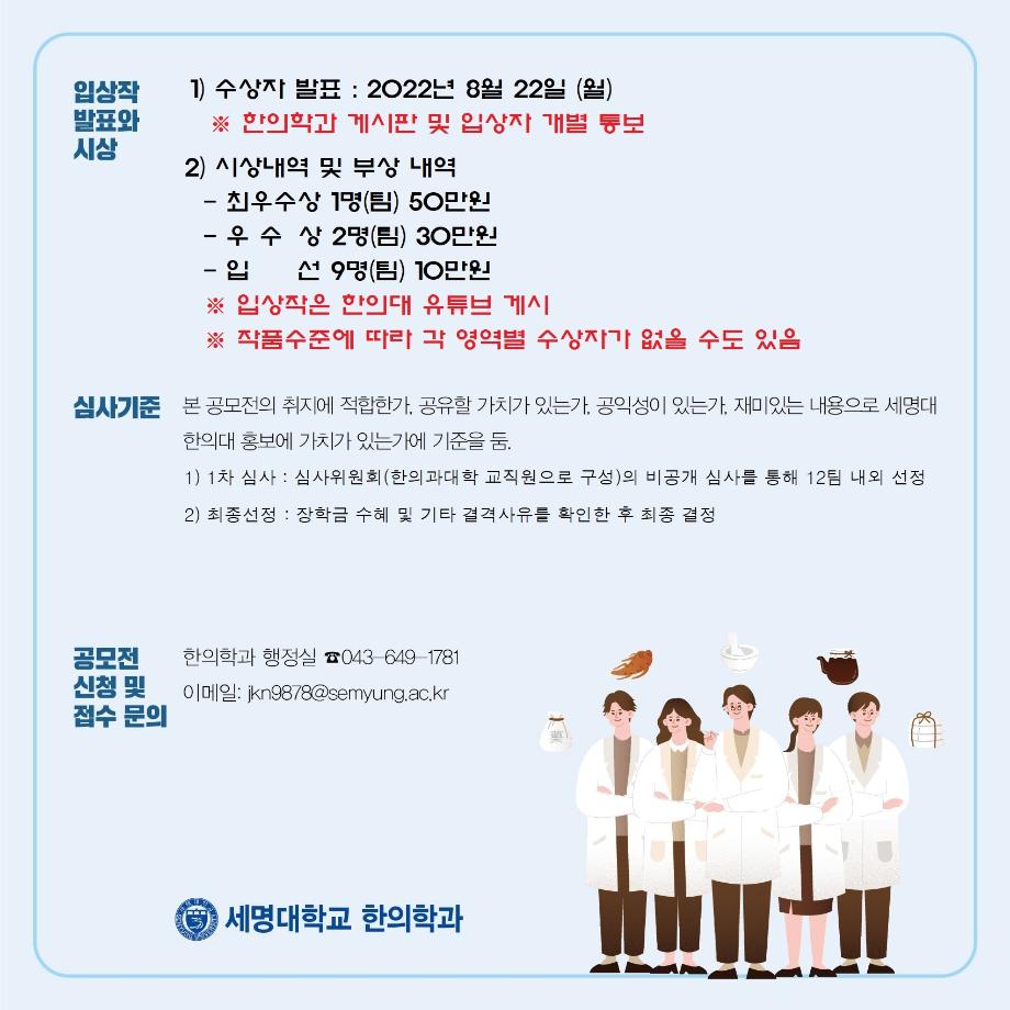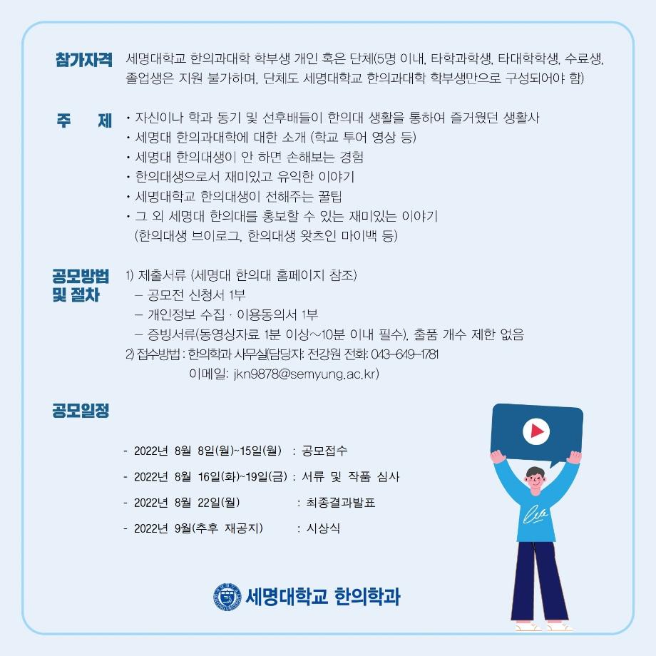 본문 시작 홈으로 대학소식 대학소개 교수소개 대학과정 커뮤니티 대학원 대학소식 홈페이지가이드 포토갤러리 학과공지 포토갤러리 발전기금 위원회 관련사이트 포토갤러리 페이스북 트위터 프린트 슬기로운 한의대 생활 학생경험 스토리 유튜브 UCC 공모전 한의과대학 3082 2022-07-01 슬기로운 한의대 생활 학생경험 스토리 유튜브 UCC 공모전 접수기간 : 2022.08.08(월) ~ 2022.08.15(월) 신청 및 접수 : 한의학과 행정실 (043-649-1781) 이메일 주소 : jkn9878@semyung.ac.kr 목록 이전[중등교육 연계프로그램] 충주 대원고등학교 특강 다음 <2022년 7월 1일자 한의과대학 보직 임명사항 안내> 담당부서 : 한의과대학 담당자 : - 연락처 : 043-649-1701 최종수정일 : 2024-10-26 만족도조사 만족도 조사 이 페이지에서 제공하는 정보에 대하여 만족하시나요? 매우만족 만족 보통 불만족 매우불만족