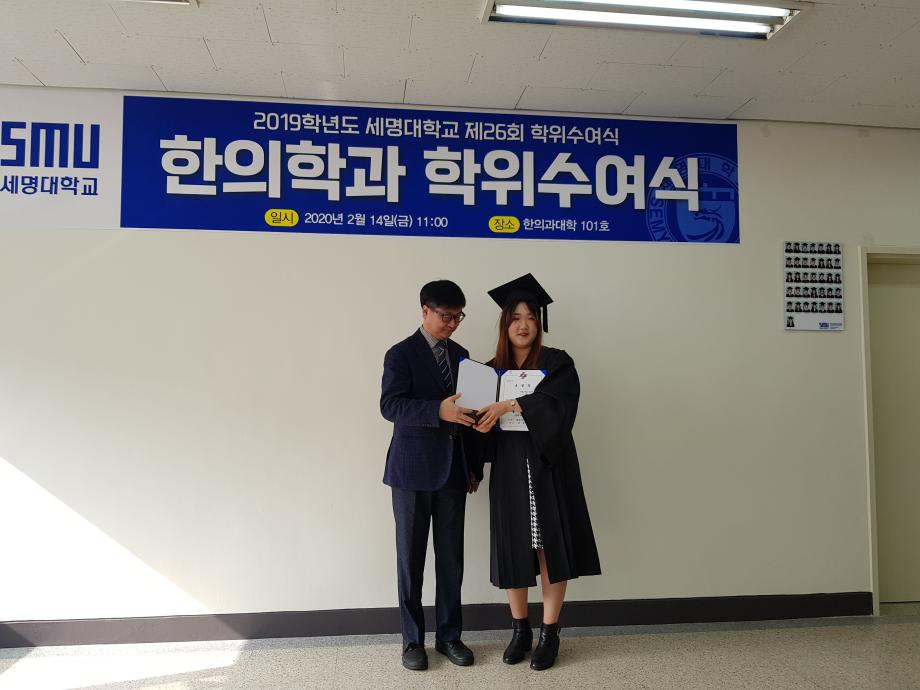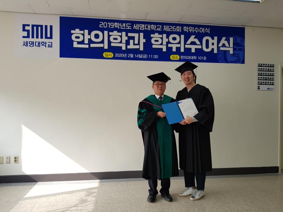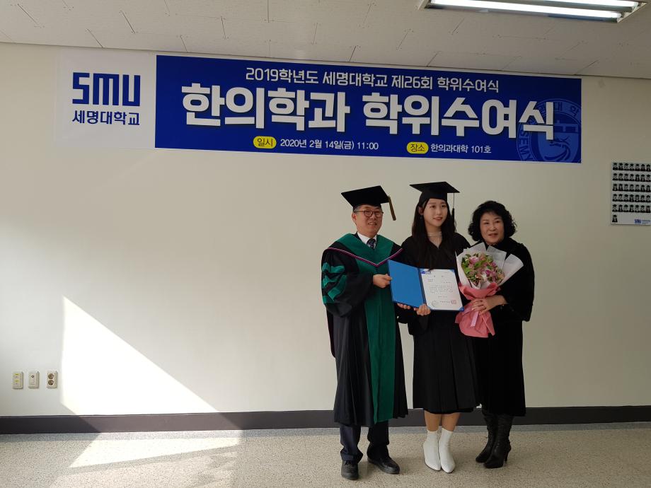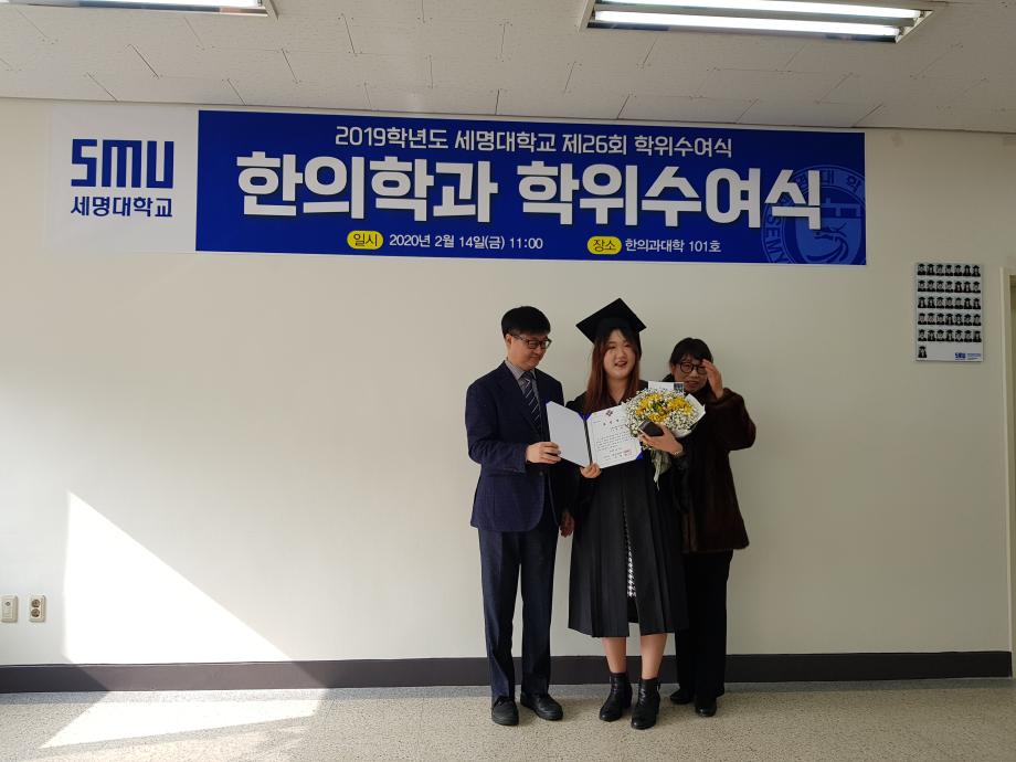 본문 시작 홈으로 대학소식 대학소개 교수소개 대학과정 커뮤니티 대학원 대학소식 홈페이지가이드 포토갤러리 학과공지 포토갤러리 발전기금 위원회 관련사이트 포토갤러리 페이스북 트위터 프린트 2019학년도 한의학과 전기 학위수여식 한의과대학 12297 2020-02-18 한의학과 졸업생들 모두에게 졸업을 축하드립니다. 코로나19의 발생으로 교육부 지침에 따라 세명대학교 공식 학위수여식이 취소되어 한의과대학에서 졸업자 시상식(총장상, 한의사협회장상, 한의학회장상, 동문회장상 등)으로 조촐하게 진행하였습니다. 아울러, 졸업예정자의 학사 학위(졸업장)은 학과사무실에서 택배로 개별 송부하였음을 알려드립니다. 목록 이전2019학년도 한의학교육 교수워크샵 다음 제76회 한의사 국가고시 4년 연속 재학생 100% 합격 담당부서 : 한의과대학 담당자 : - 연락처 : 043-649-1701 최종수정일 : 2024-10-26 만족도조사 만족도 조사 이 페이지에서 제공하는 정보에 대하여 만족하시나요? 매우만족 만족 보통 불만족 매우불만족
