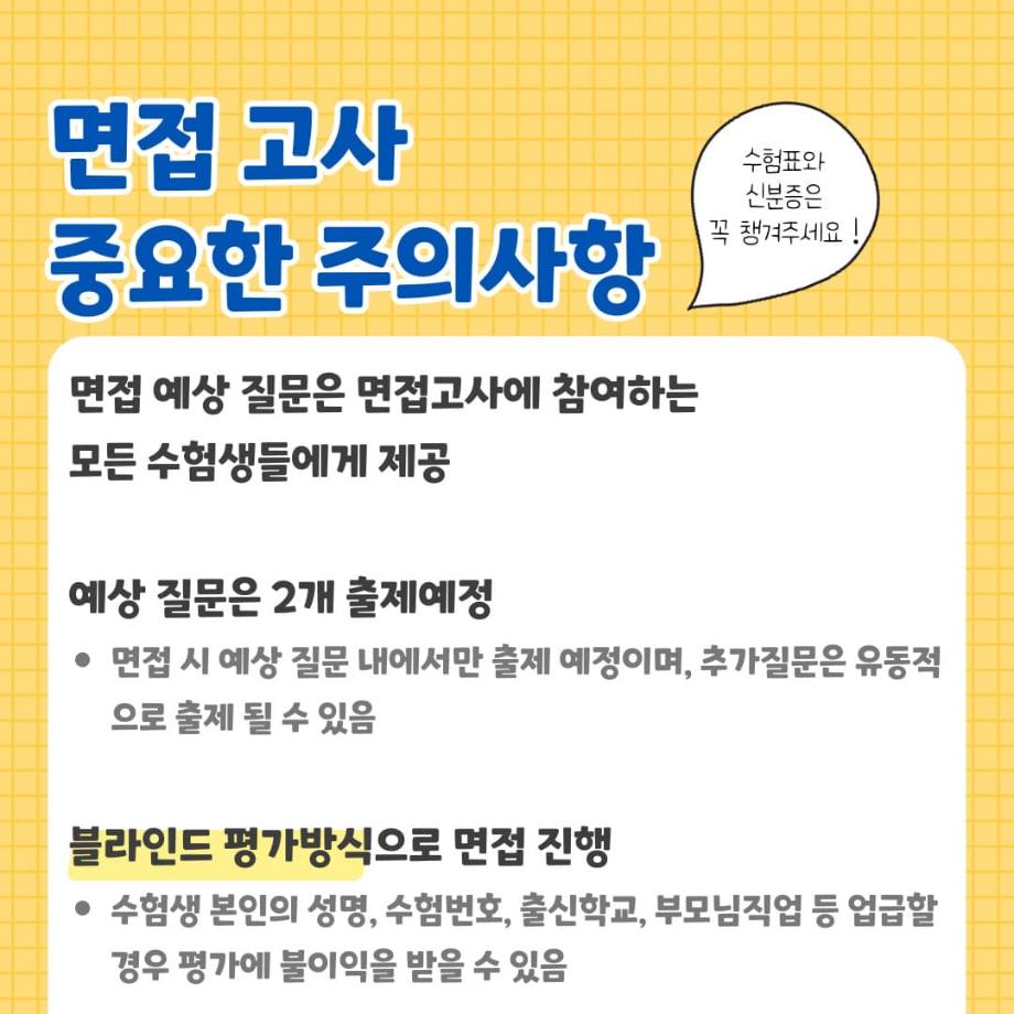 입시생분들께서 궁금해하실 면접 Tip, 면접에 관한 자세한 정보들을 카드뉴스로 제작해보았습니다 🔍