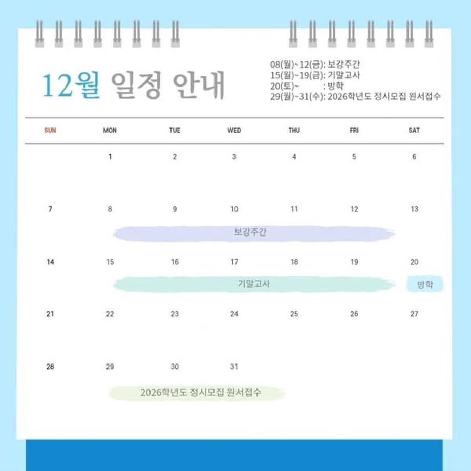 본문 시작 홈으로 커뮤니티 학과소개 입학정보 교과과정 커뮤니티 홈페이지가이드 포토갤러리 SNS 소통 공간 포토갤러리 공지사항 동아리 포토갤러리 페이스북 트위터 프린트 12월 다이어리 항공서비스학과 3045 2025-12-02 안녕하십니까 세명대학교 항공서비스학과 온라인 홍보국 💙푸르미르💙입니다. 12월에는 기말고사와 2026학년도 정시모집 원서접수가 있습니다! 확인하시고 일정에 착오 없으시길 바라겠습니다 😊 소중한 꿈을 품고 그 누구보다 높이 오를 여러분을 저희 "푸르미르" 가 항상 응원하겠습니다 ✈💙 궁금한 사항이 있으시다면 언제든지 SNS로 연락 주십시오 💬 #세명대학교 #항공서비스학과 #세명대 목록 이전세명대학교 편의시설 안내 다음 말레이시아 비자 발급