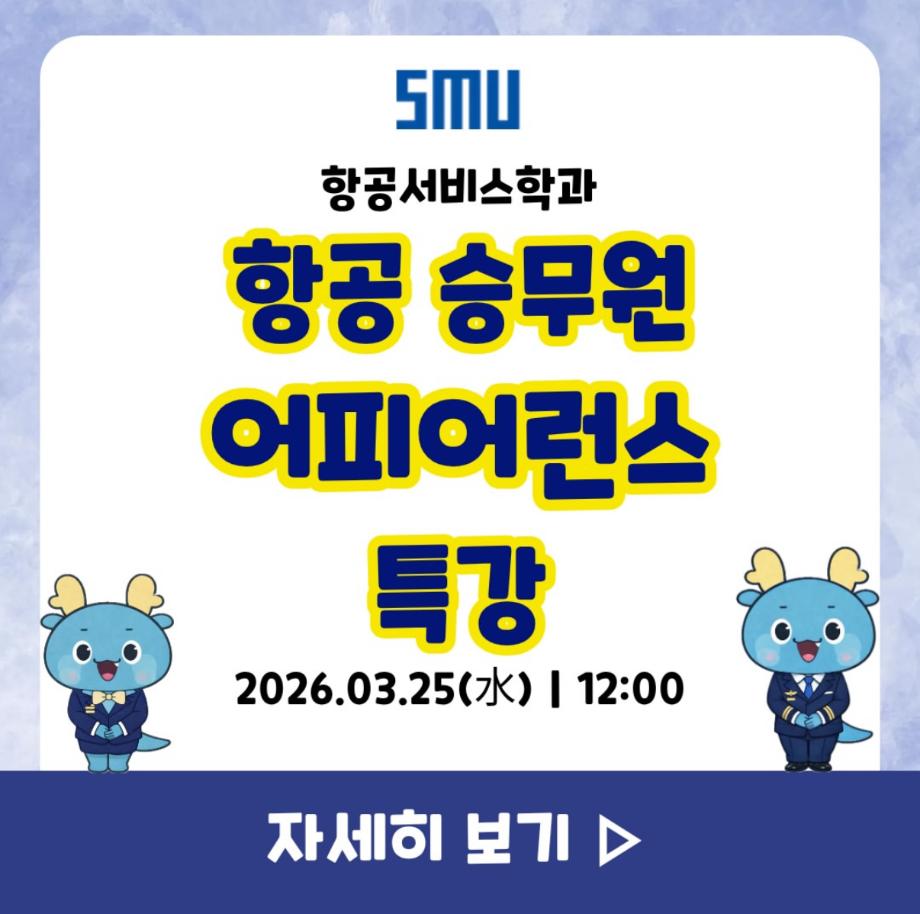 본문 시작 홈으로 커뮤니티 학과소개 입학정보 교과과정 커뮤니티 홈페이지가이드 포토갤러리 SNS 소통 공간 포토갤러리 공지사항 동아리 포토갤러리 페이스북 트위터 프린트 어피어런스 특강 항공서비스학과 23 2026-04-09 안녕하십니까 세명대학교 항공서비스학과 온라인 홍보국 💙푸르미르💙입니다. 오늘은 1학년 대상으로 어피어런스 특강을 진행했습니다! 대학 생활과 전공에 대한 이해를 높일 수 있는 유익한 시간이 되었기를 바라며, 앞으로의 학교생활에도 도움이 되기를 바랍니다 😊 소중한 꿈을 품고 누구보다 높게 오를 여러분들을 저희 ‘푸르미르‘가 항상 응원하겠습니다✈️ 궁금한 사항이 있으시다면 언제든 SNS로 연락주십시오💬 #세명대학교 #항공서비스학과 #항공과 #승무원 목록 이전4월 다이어리