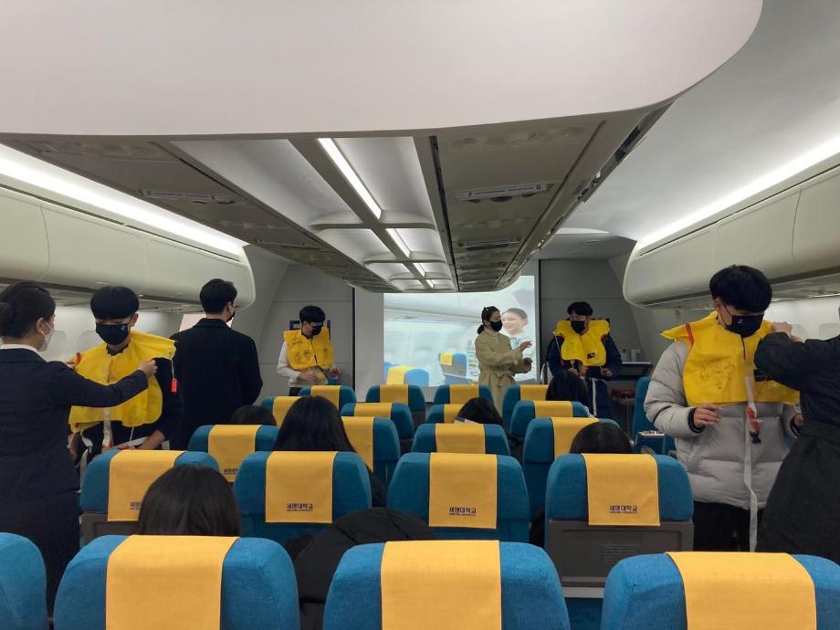 프로그램은 1)기내 안전 데모 체험, 2)기내 방송 실습, 3)학생회관 식사, 4)학교기업 세네뜨리아 견학, 5)음성 이미지 수업, 6)실습실 견학, 7)의림지 테마파크 체험 순서로 이루어졌습니다.