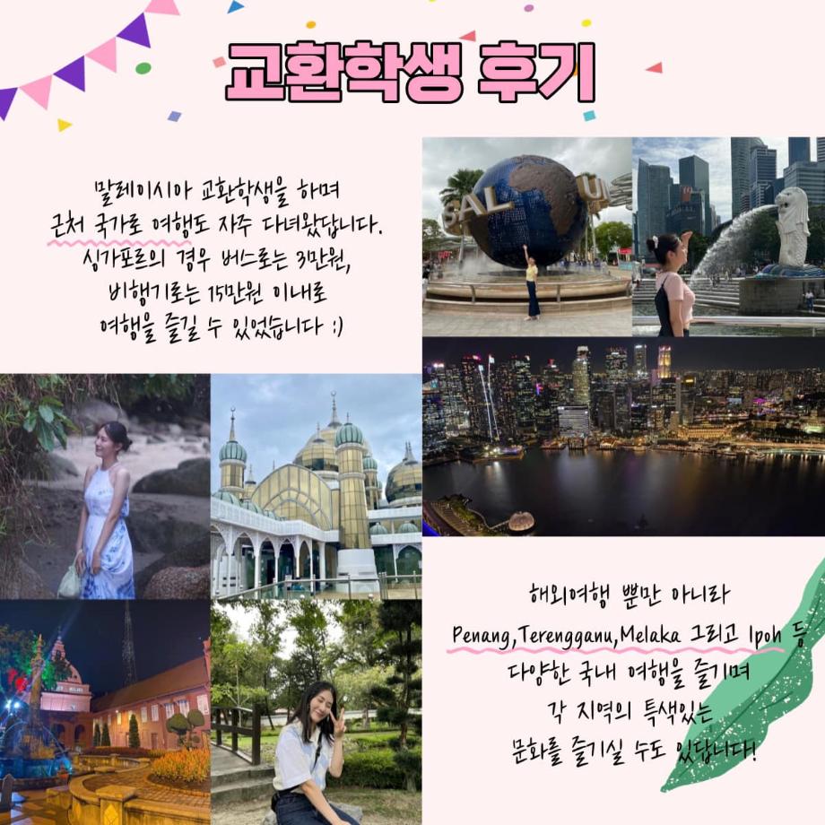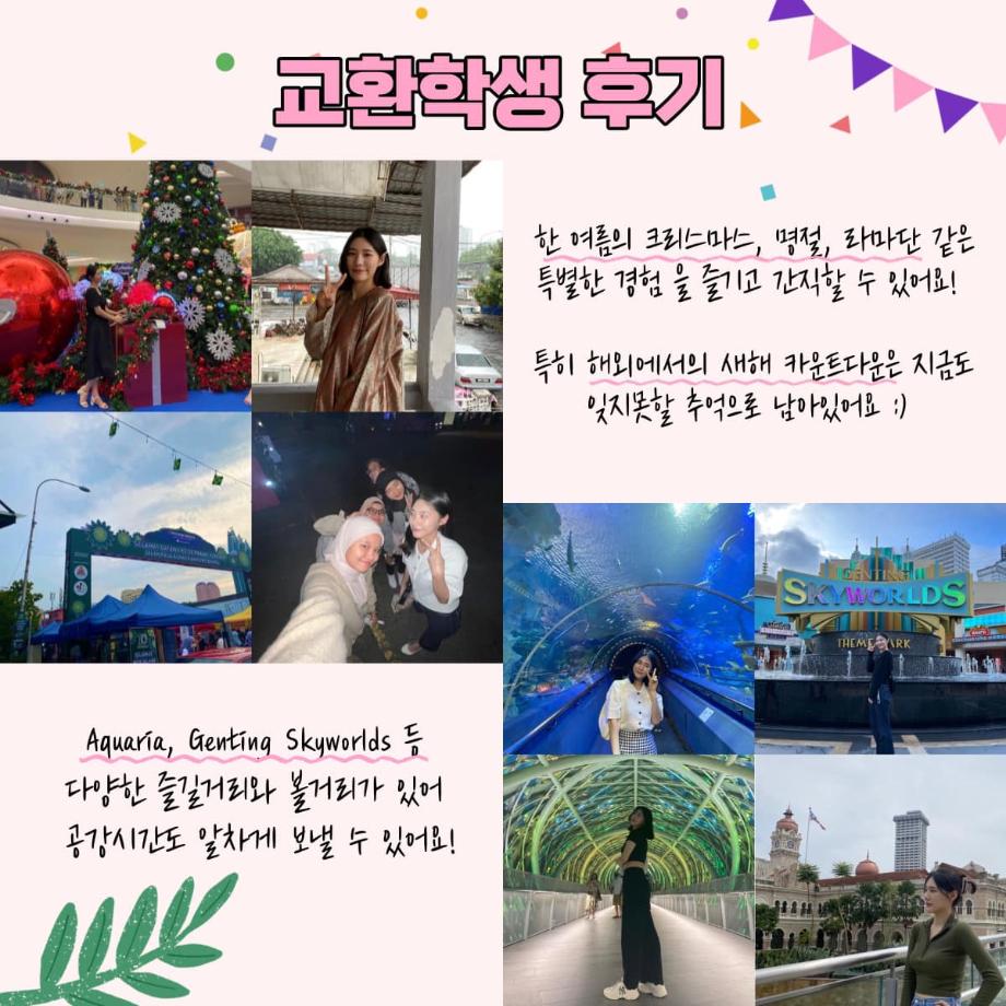 그 중 말레이시아 쿠알라룸푸르대학으로 교환학생을 직접 다녀오신 20학번 재학생분의 생생한 후기를 카드뉴스로 제작해보았습니다 🔍
