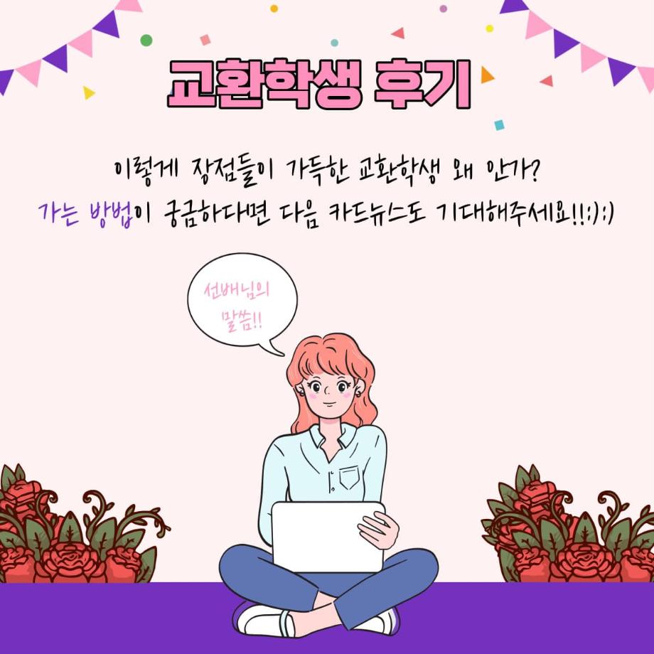 많은 장점들로 가득한 교환학생에 관한 정보를 저희 푸르미르에서 앞으로도 전해드릴 예정이니 많은 기대 부탁드립니다