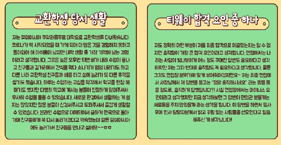 인터뷰에 응해주신 선배님들께 감사드리며 더 높이 날아오르실 선배님들의 앞날을 항상 응원하겠습니다 ☺️