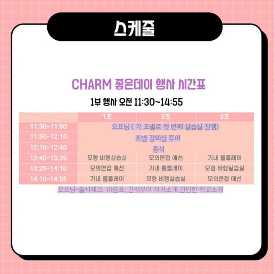 CHARM 좋은데이 행사의 자세한 일정과 관련 공지사항을 카드뉴스로 간단하게 정리해보았으니 지원자분들께서는 참고해주시길 바랍니다 🔍