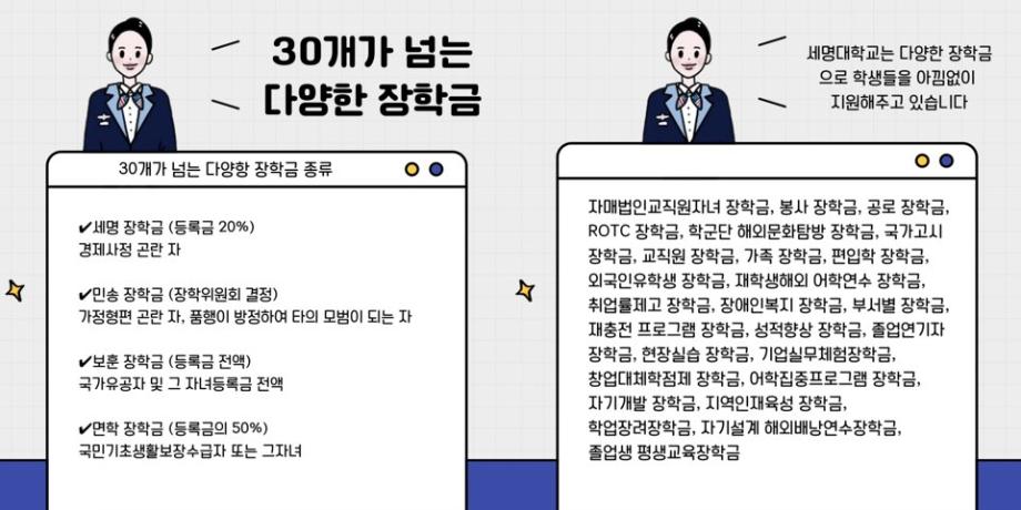저희 세명대학교는 30개가 넘는 장학금으로 아낌없이 지원해주며 학생들도 실제로도 부담 없이 학교생활을 하고 있습니다