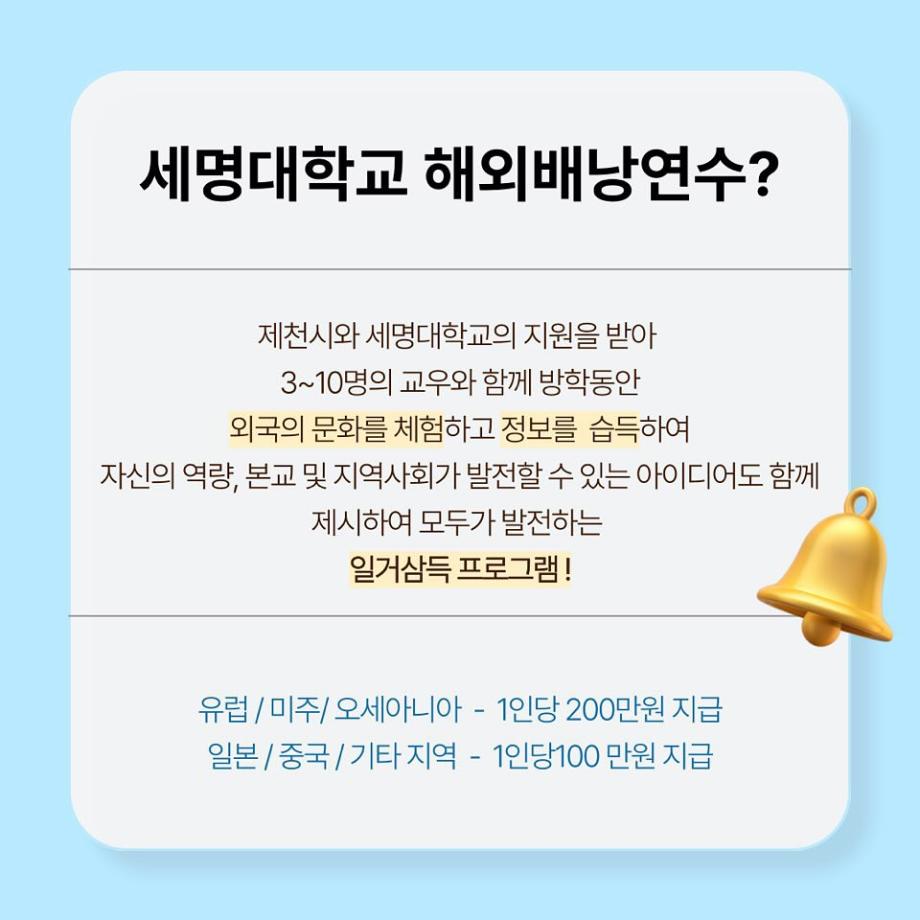 제천시와 세명대학교의 지원을 받아 3~10명의 교우와 함께 방학 동안 외국의 문화를 체험하고 정보를 습득하여 자신의 역량, 본교 및 지역사회가 발전할 수 있는 아이디어도 함께 제시하여 모두가 발전할 수 있는 프로그램입니다