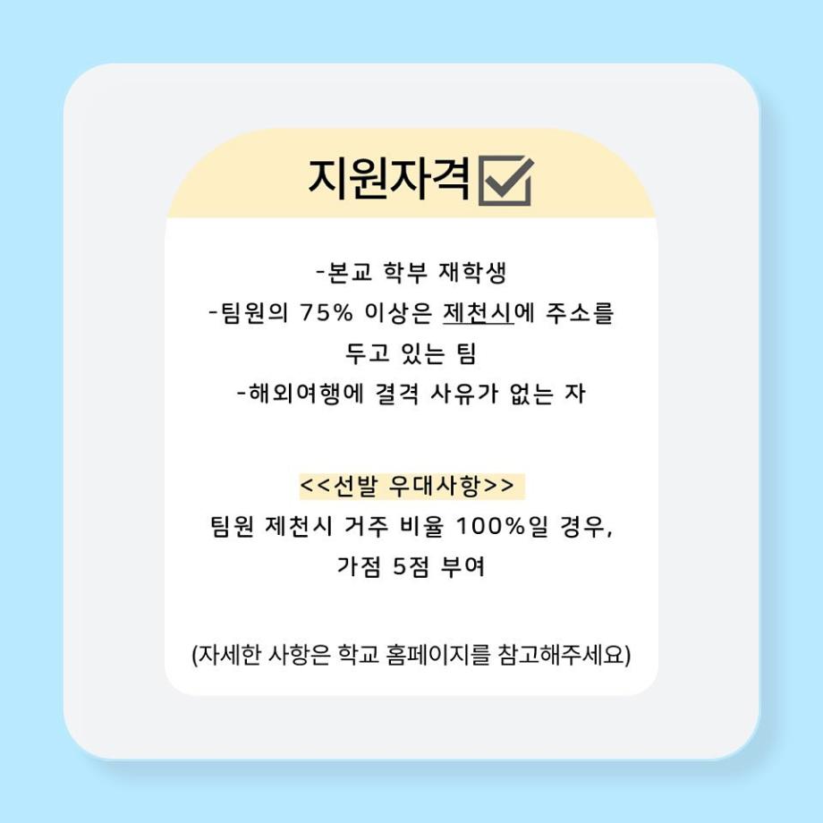 본교 학부 재학생으로 팀원의 75% 이상은 제천시에 주소를 두고 있어야 합니다. 또한 해외여행에 결격사유가 없어야 합니다