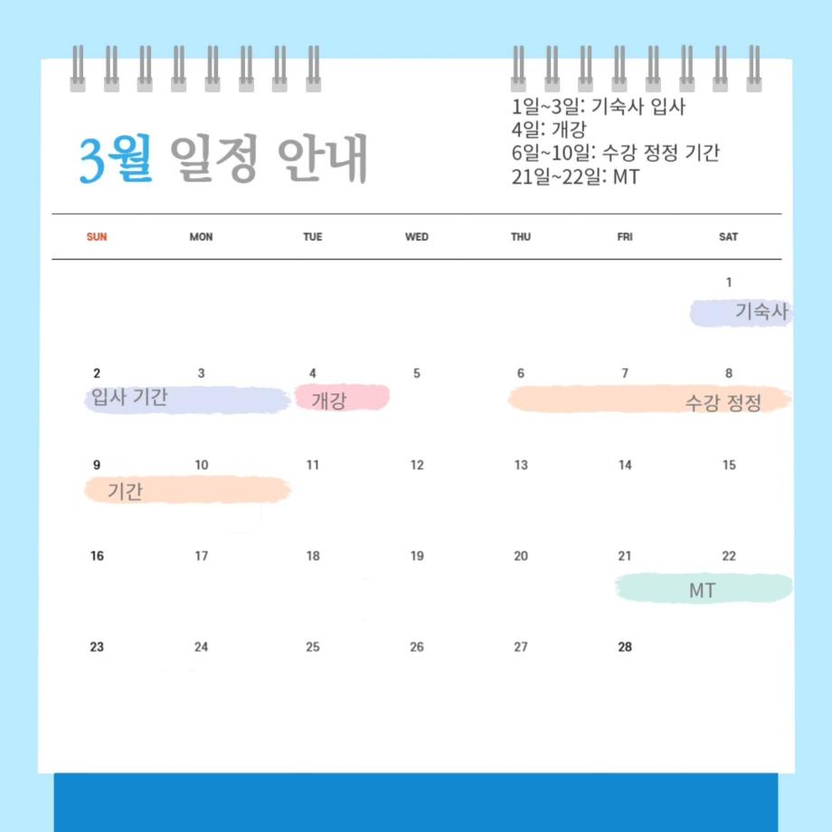 오늘은 3월을 맞이하여 3월 다이어리를 가져왔습니다! 3월에는 개강과 수강 정정 기간, MT가 있습니다☺️