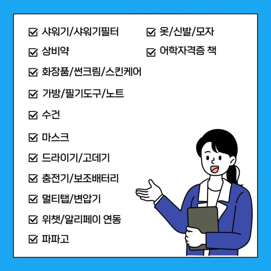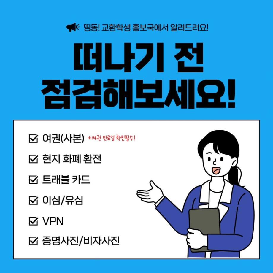 본문 시작 홈으로 커뮤니티 학과소개 입학정보 교과과정 커뮤니티 홈페이지가이드 포토갤러리 SNS 소통 공간 포토갤러리 공지사항 동아리 포토갤러리 페이스북 트위터 프린트 교환학생 체크리스트 항공서비스학과 4175 2025-08-12 안녕하십니까 세명대학교 항공서비스학과 온라인 홍보국 💙푸르미르💙입니다. 교환학생을 가기전 현지에서 꼭 필요한 물건들을 체크해야겠죠?😁 꼭 필요한 물품들을 정리해보았으니 많은 도움이 되길 바랍니다 ! 소중한 꿈을 품고 그 누구보다 높이 오를 여러분을 저희 "푸르미르" 가 항상 응원하겠습니다 ✈💙 궁금한 사항이 있으시다면 언제든지 SNS로 연락 주십시오 💬 #세명대학교 #항공서비스학과 #세명대 #항공과 #푸르미르 #교환학생 목록 이전💙에어로케이 객실승무원 취업💙 다음 🧡제주항공 객실승무원 취업🧡