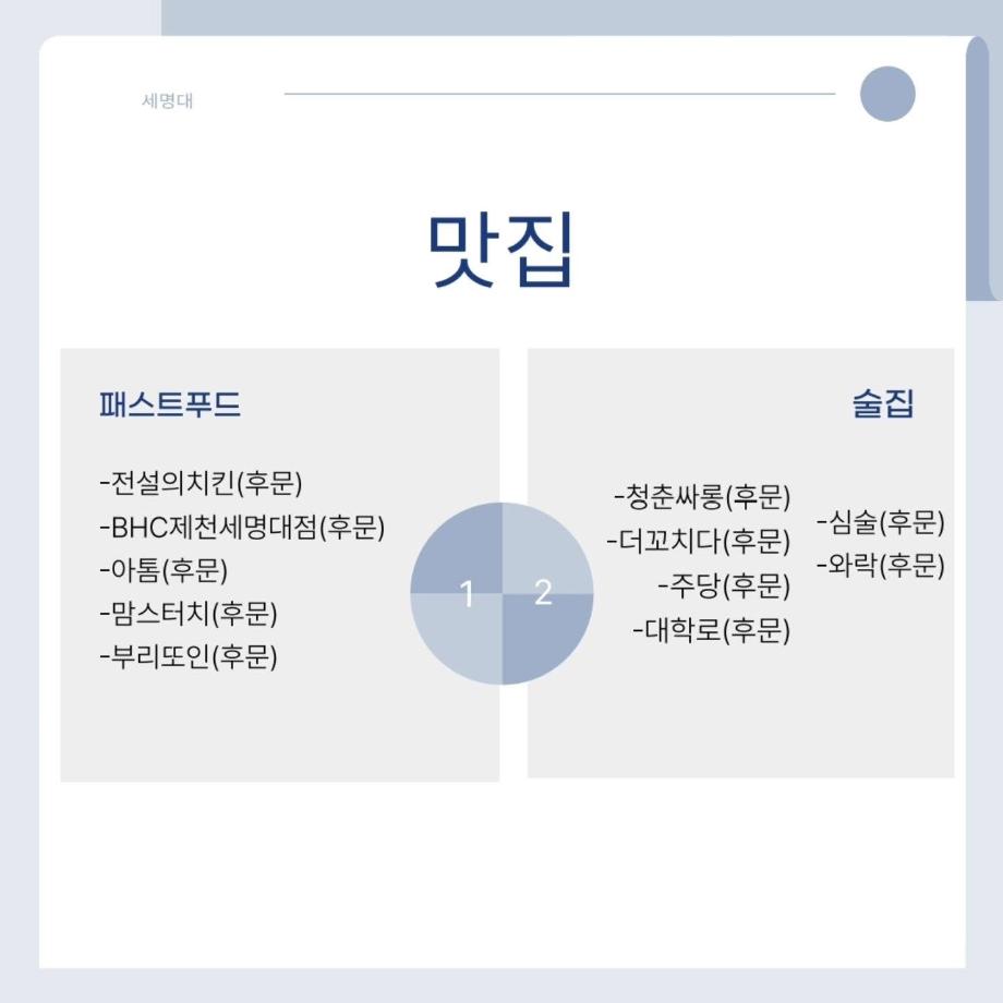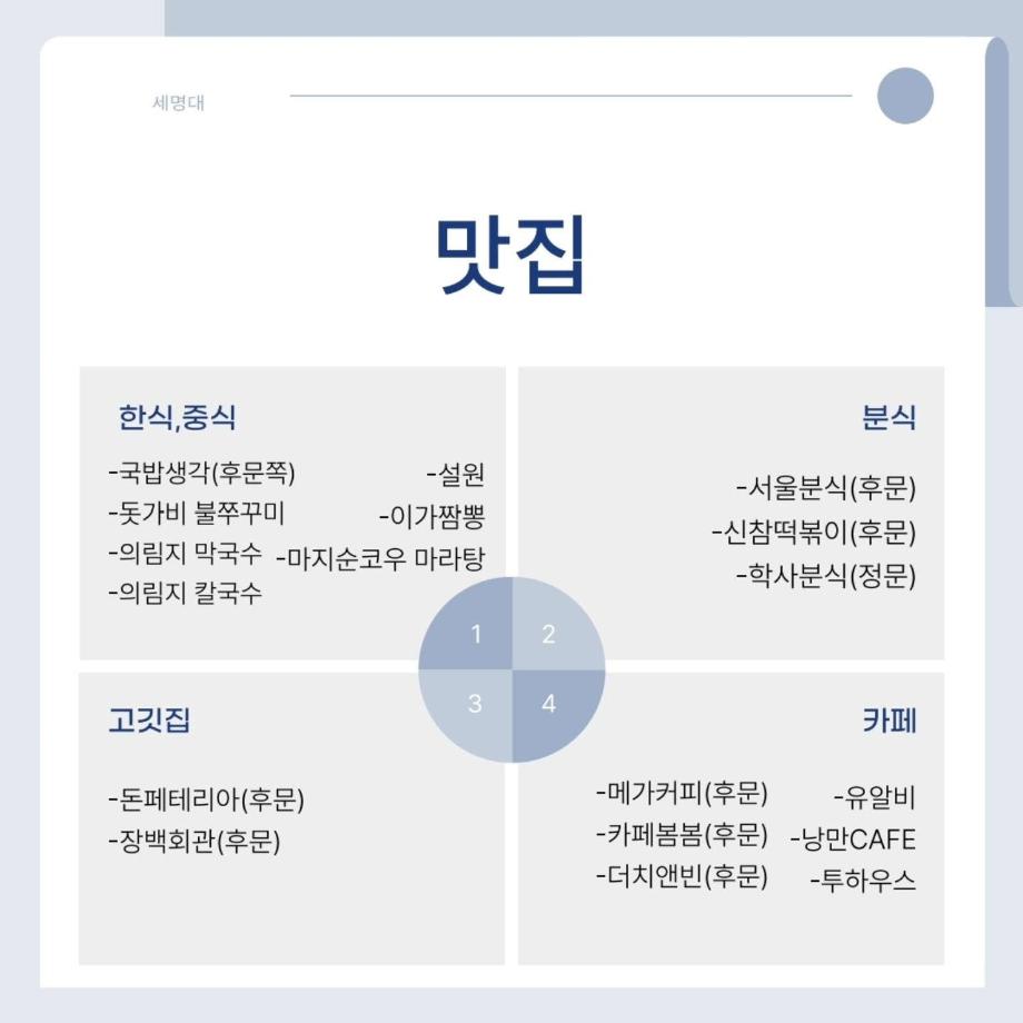 이번 게시물에서는 세명대학교 주변 맛집을 소개해드리겠습니다! 🍚🥄 한식, 중식, 분식, 고깃집 등 다양한 맛을 즐길 수 있는 식당들이 가득합니다. 😋 식사 후에는 학우들과 수다를 나누기 좋은 감성 카페도 함께 둘러보세요.☕️ 세명대학교에 오신다면 하나씩 찾아가며 맛집 리스트를 지워가는 재미도 느껴보세요!