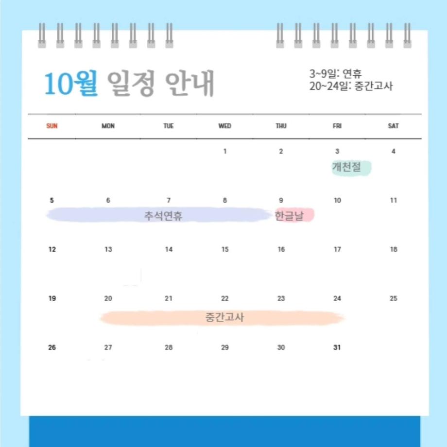 본문 시작 홈으로 커뮤니티 학과소개 입학정보 교과과정 커뮤니티 홈페이지가이드 포토갤러리 SNS 소통 공간 포토갤러리 공지사항 동아리 포토갤러리 페이스북 트위터 프린트 10월 다이어리 항공서비스학과 3765 2025-10-06 안녕하십니까 세명대학교 항공서비스학과 온라인 홍보국 💙푸르미르💙입니다. 10월에는 추석연휴와 중간고사가 있습니다! 확인하시고 일정에 착오 없으시길 바라겠습니다 😊 즐거운 연휴 보내세요🙇♂️ 소중한 꿈을 품고 그 누구보다 높이 오를 여러분을 저희 "푸르미르" 가 항상 응원하겠습니다 ✈💙 궁금한 사항이 있으시다면 언제든지 SNS로 연락 주십시오 💬 #세명대학교 #항공서비스학과 #세명대 #항공과 #푸르미르 #다이어리 목록 다음 제주항공 에듀윙 Advanced class 다음 가을 맞이 일상 사진
