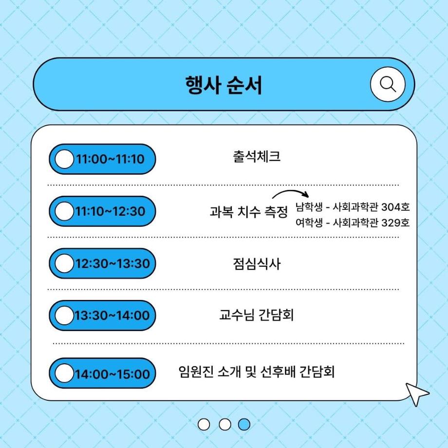 출석 체크를 시작으로 과복 치수 측정, 점심식사, 교수님 간담회 및 임원진·선후배 간담회가 순차적으로 진행될 예정입니다.