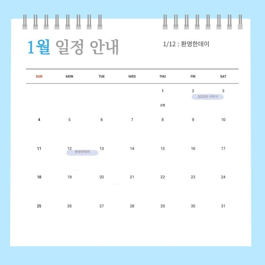 1월에는 2025년 시무식와 신입생을 위한 환영한데이가 있습니다. 😄