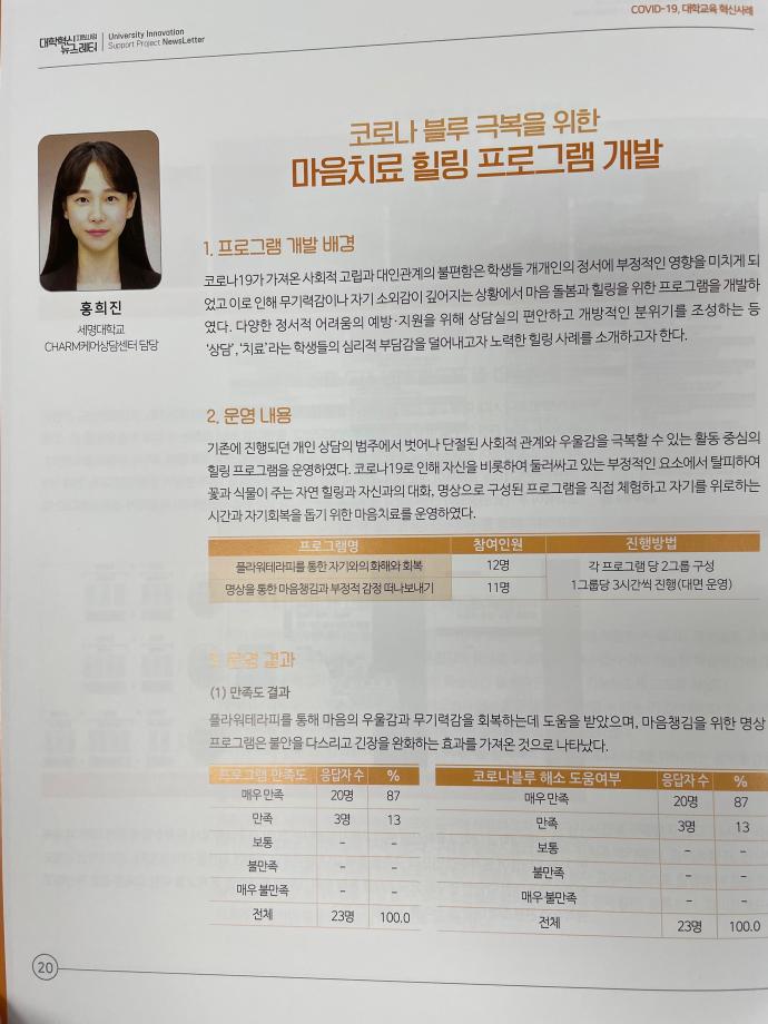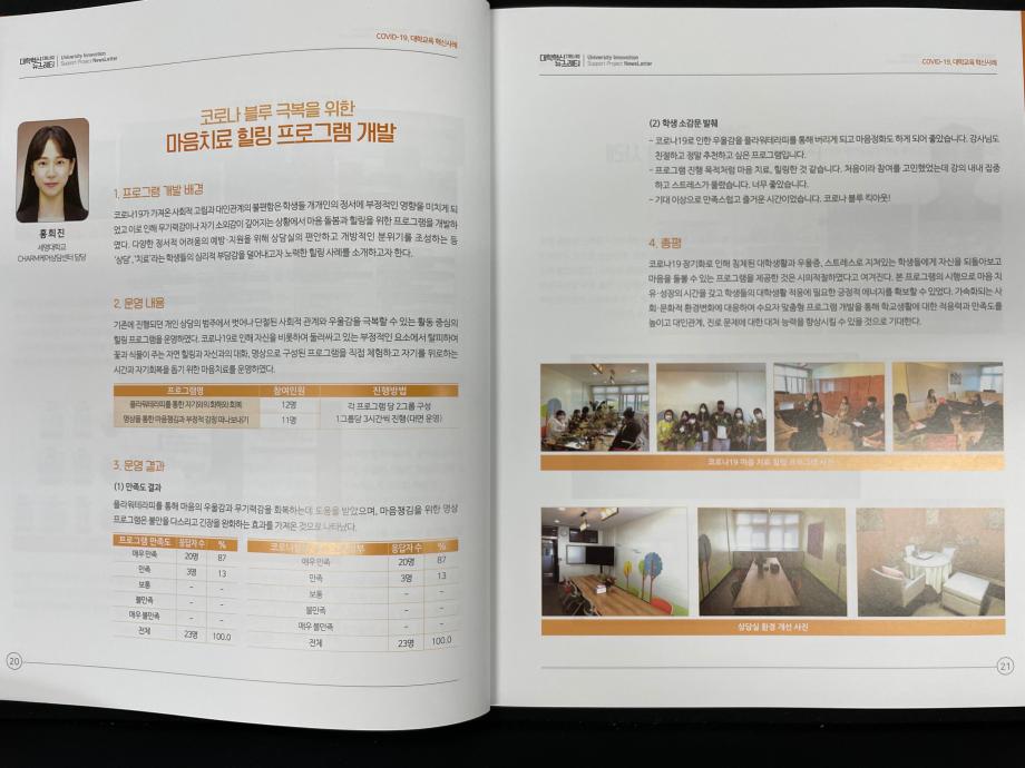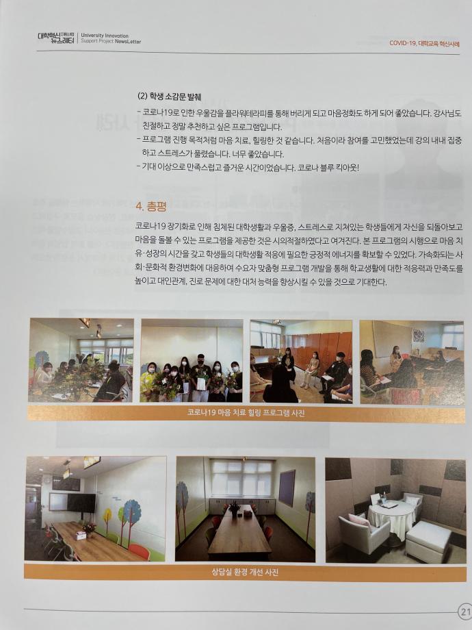 본문 시작 2021학년도 대학혁신지원사업 뉴스레터 6호 소식지 <코로나-19 마음치료 힐링 프로그램> 기재 CHARM케어상담센터 3463 2021-08-24 2021학년도 대학혁신지원사업 뉴스레터 6호 소식지에 <코로나-19 마음치료 힐링 프로그램>이 우수 프로그램으로 기재되었습니다. 목록 이전인권서포터즈 노인학대예방의날 캠페인 다음 인권서포터즈 사회복지의날 캠페인 진행 담당부서 : CHARM케어상담센터 담당자 : - 연락처 : 043-649-1789 최종수정일 : 2024-10-26 만족도조사 만족도 조사 이 페이지에서 제공하는 정보에 대하여 만족하시나요? 매우만족 만족 보통 불만족 매우불만족