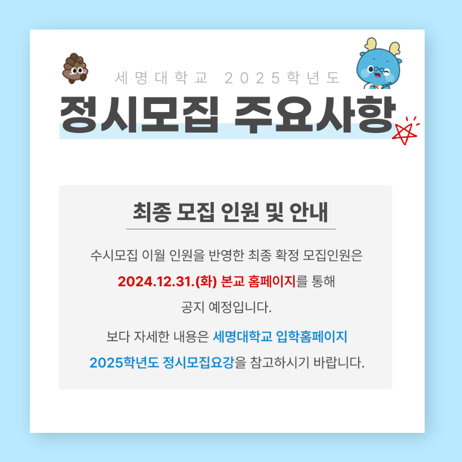 본문 시작 홈으로 커뮤니티 대학소개 학과소개 입학안내 커뮤니티 홈페이지가이드 포토갤러리 대학소식 학과소식 자료실 포토갤러리 포토갤러리 페이스북 트위터 프린트 2025학년도 정시모집 안내 IT엔지니어링대학 1993 2024-12-30 [입학안내 바로가기] 목록 이전수시모집 충원합격자 발표/등록 안내 다음 [KT희망나눔재단] 2025년 KT디지털인재장학생 선발 안내 담당부서 : AI융합대학 담당자 : - 연락처 : 043-649-7422 최종수정일 : 2024-10-26 만족도조사 만족도 조사 이 페이지에서 제공하는 정보에 대하여 만족하시나요? 매우만족 만족 보통 불만족 매우불만족