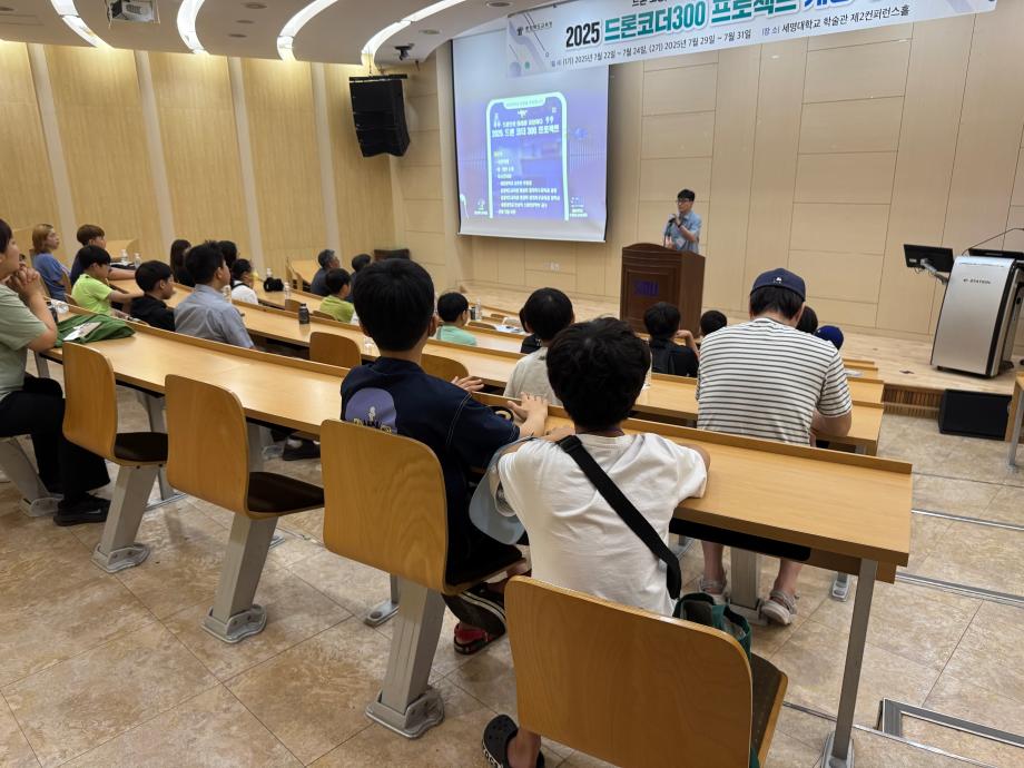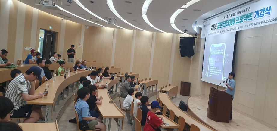 2025 드론코더300 프로젝트의 충청북도교육청에서 주최하고, 세명대학교 IT엔지니어링대학과 스마트IT학부에서 주관하는 프로그램으로 드론 조종, 드론 코딩, 자율주행차 아두이노 코딩 3개 영역 총 20시간으로 구성되었으며, 세명대학교 스마트IT학부 한상익 교수가 교육을 총괄하였고 재학생 6명이 보조 교사로 참여하였다. 참여 학생들은 드론 조종 시뮬레이터를 활용하여 조종 실습을 해보고, 유소년 축구 드론을 이용하여 실제 드론 조종 경험을 해볼 수 있었다. 스크레치 코딩으로 드론이 다양한 모양을 그리며 비행하고 LED 모듈에 원하는 그림도 코딩으로 그려보았으며, C언어를 이용하여 자율주행차가 주어진 경로를 주행할 수 있게 코딩하는 시간을 가졌다. 보조 교사 1명이 3~4명의 학생을 담당하여 교육의 질을 향상할 수 있었다.