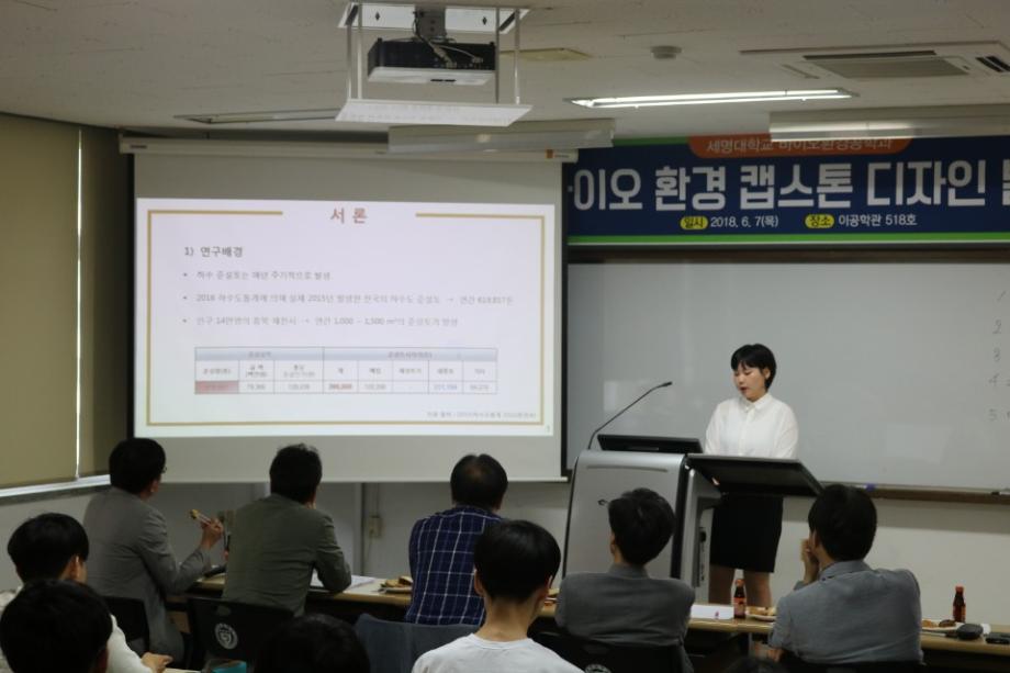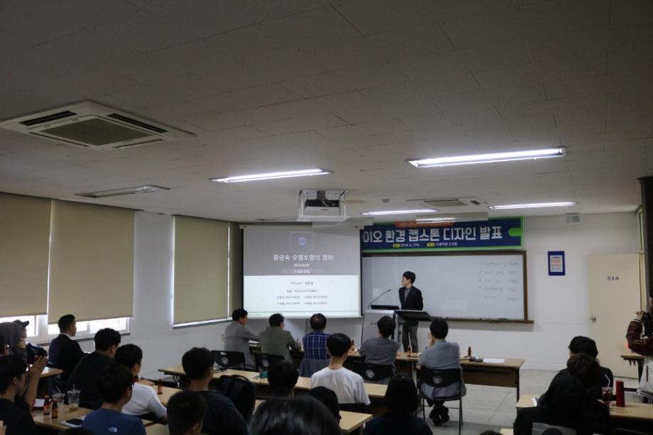 본문 시작 홈으로 커뮤니티 대학소개 학과소개 입학안내 커뮤니티 홈페이지가이드 포토갤러리 대학소식 학과소식 자료실 포토갤러리 포토갤러리 페이스북 트위터 프린트 2018학년도 바이오 환경 캡스톤 디자인 발표회 실시 IT엔지니어링대학 6528 2018-06-07 2018년 6월 7일(목) 11시 30분 부터 13시 30분까지 이공학관 518호에서 바이오 환경 캡스톤 디자인 발표를 진행 하였다. 바이오환경공학과 4학년 학생들은 2018학년도 1학기 동안 5개조(4학년)26명이 연구에 참여했으며, 1학기 동안 쉽지 않은 주제로 연구를 하느라 고생하였다. 발표회에는 재학생 80여명이 참석하여 선배들의 연구내용을 들었다. 이번 연구는 졸업논문을 대체한 것이다. 목록 이전2018학년도 대학일자리센터 지원 IT엔지니어링대학 임직원 취업특강 1차실시 다음 2018 전자공학과 캡스톤디자인 졸업작품 발표회 실시 담당부서 : AI융합대학 담당자 : - 연락처 : 043-649-7422 최종수정일 : 2024-10-26 만족도조사 만족도 조사 이 페이지에서 제공하는 정보에 대하여 만족하시나요? 매우만족 만족 보통 불만족 매우불만족