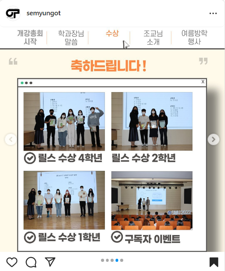 본문 시작 홈으로 커뮤니티 학과소개 진로 및 취업 학과과정 커뮤니티 SNS 홈페이지가이드 학과 소식 및 행사 학과공지 학과 소식 및 행사 대학생활 엿보기 어쩌다 출근 챌린지 학생회 동아리 통학버스 시간표 학과 소식 및 행사 페이스북 트위터 프린트 2022-2학기 개강총회 작업치료학과 4364 2022-09-05 목록 이전실습모듬후기 1편 다음 2022-2학기 개강총회 사진 담당부서 : 작업치료학과 담당자 : - 연락처 : 043-649-1632 최종수정일 : 2024-10-26 만족도조사 만족도 조사 이 페이지에서 제공하는 정보에 대하여 만족하시나요? 매우만족 만족 보통 불만족 매우불만족