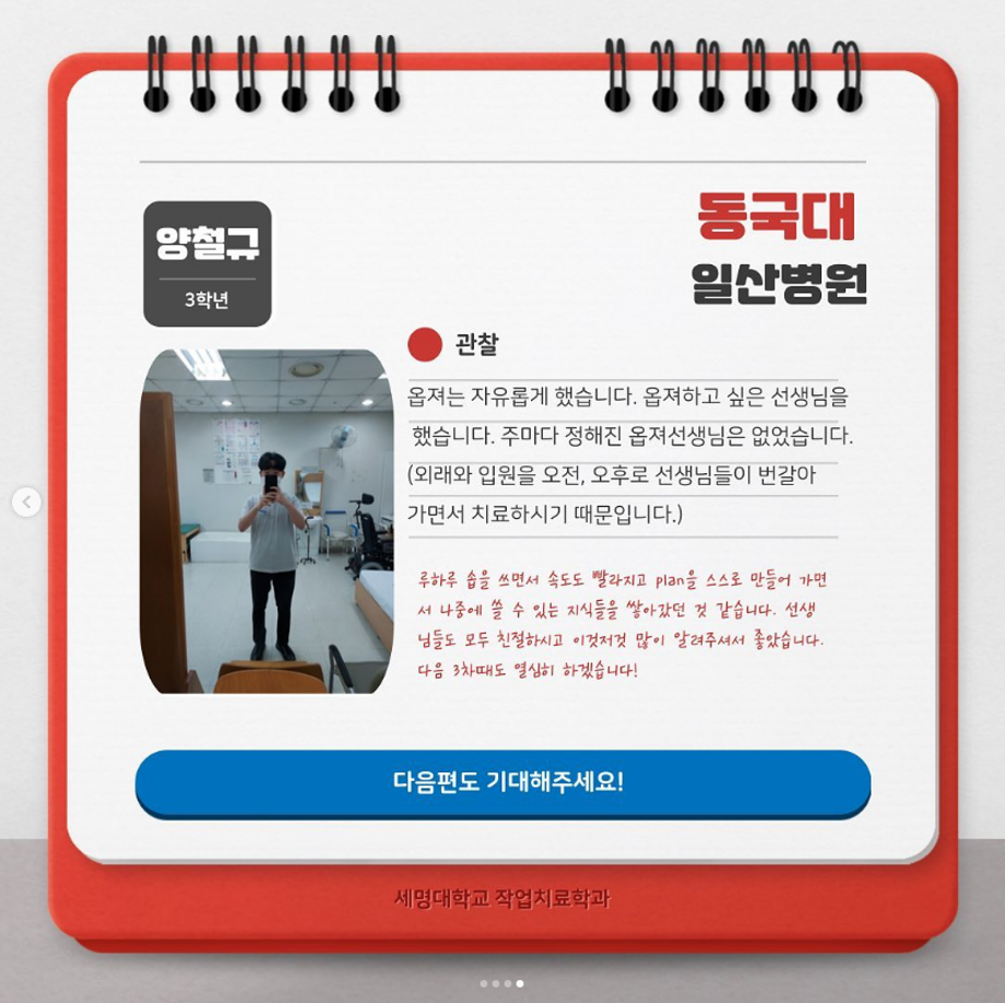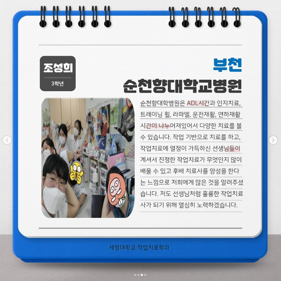 본문 시작 홈으로 커뮤니티 학과소개 진로 및 취업 학과과정 커뮤니티 SNS 홈페이지가이드 학과 소식 및 행사 학과공지 학과 소식 및 행사 대학생활 엿보기 어쩌다 출근 챌린지 학생회 동아리 통학버스 시간표 학과 소식 및 행사 페이스북 트위터 프린트 2022 실습후기모음 (아동파트 대학병원, 종합병원) 작업치료학과 4792 2022-11-01 목록 이전동아리 소개 [초코파이] 다음 동아리 소개 [지태사] 담당부서 : 작업치료학과 담당자 : - 연락처 : 043-649-1632 최종수정일 : 2024-10-26 만족도조사 만족도 조사 이 페이지에서 제공하는 정보에 대하여 만족하시나요? 매우만족 만족 보통 불만족 매우불만족