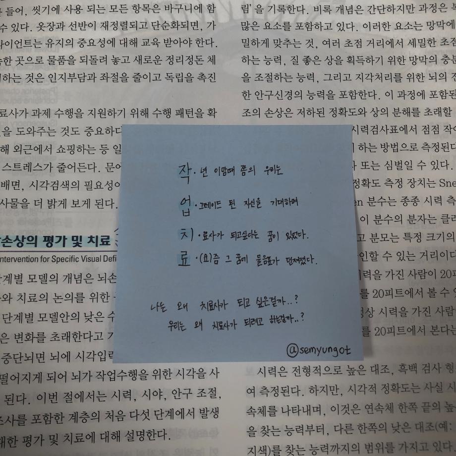 본문 시작 홈으로 커뮤니티 학과소개 진로 및 취업 학과과정 커뮤니티 SNS 홈페이지가이드 학과 소식 및 행사 학과공지 학과 소식 및 행사 대학생활 엿보기 어쩌다 출근 챌린지 학생회 동아리 통학버스 시간표 학과 소식 및 행사 페이스북 트위터 프린트 작업치료 4행시 콘테스트 작업치료학과 7807 2020-06-16 많은 사람에게 작업치료가 무엇인지 알리고, 대중화되길 바라는 마음으로 "작업치료"로 4행시 콘테스트를 진행하게 되었습니다. 4행시 콘데스트로 단순히 작업치료를 알릴 뿐만 아니라, 작업치료학과 학생으로서 한 번 더 생각해보고 자아 성찰하는 시간을 갖게 된 것 같습니다. 목록 이전2020학년도 온라인강의 실시 다음 마스크 인증샷 챌린지 담당부서 : 작업치료학과 담당자 : - 연락처 : 043-649-1632 최종수정일 : 2024-10-26 만족도조사 만족도 조사 이 페이지에서 제공하는 정보에 대하여 만족하시나요? 매우만족 만족 보통 불만족 매우불만족