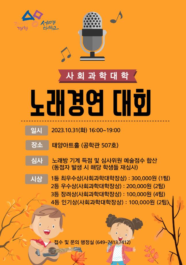 본문 시작 홈으로 커뮤니티 학과소개 학생진로 교과과정 커뮤니티 학과 SNS 홈페이지가이드 학과 갤러리 공지사항 대학원 학과 갤러리 학과 이야기 동아리 학생회 학과 갤러리 페이스북 트위터 프린트 [경영학과] 사회과학대학 노래경연대회 수상 경영학과 3311 2023-11-16 안녕하세요, 세명대학교 경영학과입니다! 10월 31일 화요일에 진행되었던 사회과학대학 노래경연대회에서 20학번 문정현 학생은 최우수상을, 21학번 신인애 학생은 장려상을 수상하였습니다! 멋진 무대와 감미로운 노래 실력 보여준 두 학생에게 큰 박수 부탁드립니다ㅎㅎ 목록 이전[경영학과] 대학원 논문 발표 다음 [경영학과] 한국생산관리학회 우수발표 논문상 수상 담당부서 : 경영학과 담당자 : - 연락처 : 043-649-1766 최종수정일 : 2024-10-26 만족도조사 만족도 조사 이 페이지에서 제공하는 정보에 대하여 만족하시나요? 매우만족 만족 보통 불만족 매우불만족