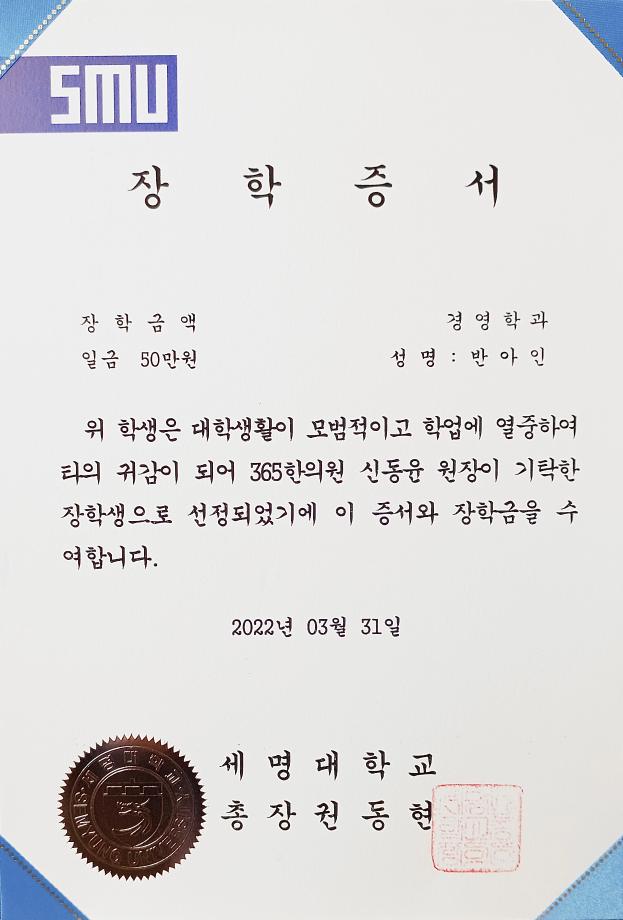 본문 시작 홈으로 커뮤니티 학과소개 학생진로 교과과정 커뮤니티 학과 SNS 홈페이지가이드 학과 갤러리 공지사항 대학원 학과 갤러리 학과 이야기 동아리 학생회 학과 갤러리 페이스북 트위터 프린트 경영학과 20학번 반아인 장학생 경영학과 2599 2022-04-06 03월 31일, 경영학과 20학번 반아인 학생은 학업성적이 우수하고 성실한 학과 생활로 타의 귀감이 되어 365한의원 신동윤 대표원장이 기탁한 장학생으로 선정되었으며 장학금 기탁 및 장학증서 수여식에 참석하였습니다. 목록 이전사회 새내기의 필수 역량 강화 다음 2022 경영학과 체육대회 담당부서 : 경영학과 담당자 : - 연락처 : 043-649-1766 최종수정일 : 2024-10-26 만족도조사 만족도 조사 이 페이지에서 제공하는 정보에 대하여 만족하시나요? 매우만족 만족 보통 불만족 매우불만족
