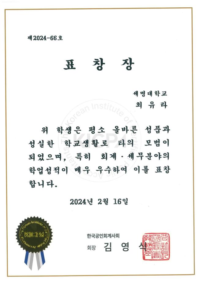 본문 시작 홈으로 커뮤니티 학과소개 학생진로 교과과정 커뮤니티 학과 SNS 홈페이지가이드 학과 갤러리 공지사항 대학원 학과 갤러리 학과 이야기 동아리 학생회 학과 갤러리 페이스북 트위터 프린트 [경영학과] 이유진, 최유라 학생 한국공인회계사회장 표창 경영학과 2650 2024-02-29 2024년도 졸업생 중 성적이 우수하며 AT자격(FAT, TAT)소지자인 “이유진(19학번)” “최유라(19학번)” 대하여 표창 및 부상을 시상하였다. 목록 이전[경영학과] 2024학년도 신입생 환영 영상 다음 [경영학과] 제 30회 경영학과 학위수여식 담당부서 : 경영학과 담당자 : - 연락처 : 043-649-1766 최종수정일 : 2024-10-26 만족도조사 만족도 조사 이 페이지에서 제공하는 정보에 대하여 만족하시나요? 매우만족 만족 보통 불만족 매우불만족