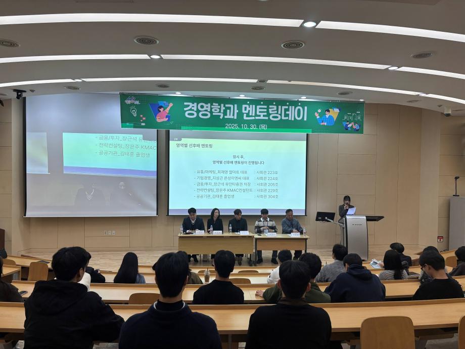 본문 시작 홈으로 커뮤니티 학과소개 학생진로 교과과정 커뮤니티 학과 SNS 홈페이지가이드 학과 갤러리 공지사항 대학원 학과 갤러리 학과 이야기 동아리 학생회 학과 갤러리 페이스북 트위터 프린트 [경영학과] 멘토링데이 행사 경영학과 1283 2025-11-03 10월 30일(목) 17시, 학술관 102호에서 경영학과 멘토링데이가 개최되었습니다. 1부에서는 맞춤형 진로/직무 멘토링이, 2부에서는 멘토-멘티 간 자유로운 교류 및 1:1 멘토링, 저녁 식사가 진행되었습니다. 이번 멘토링데이를 통해 학생들이 진로에 대한 이해와 자기주도적 성장 의지를 높일 수 있는 시간이었습니다. 참여해 주신 모든 멘토 멘티 여러분, 수고 많으셨습니다! 목록 이전[일반대학원 경영학과] 논문 발표 및 논문심사 다음 [경영학과] 25년 전기 학위수여식 학과행사 담당부서 : 경영학과 담당자 : - 연락처 : 043-649-1766 최종수정일 : 2024-10-26 만족도조사 만족도 조사 이 페이지에서 제공하는 정보에 대하여 만족하시나요? 매우만족 만족 보통 불만족 매우불만족