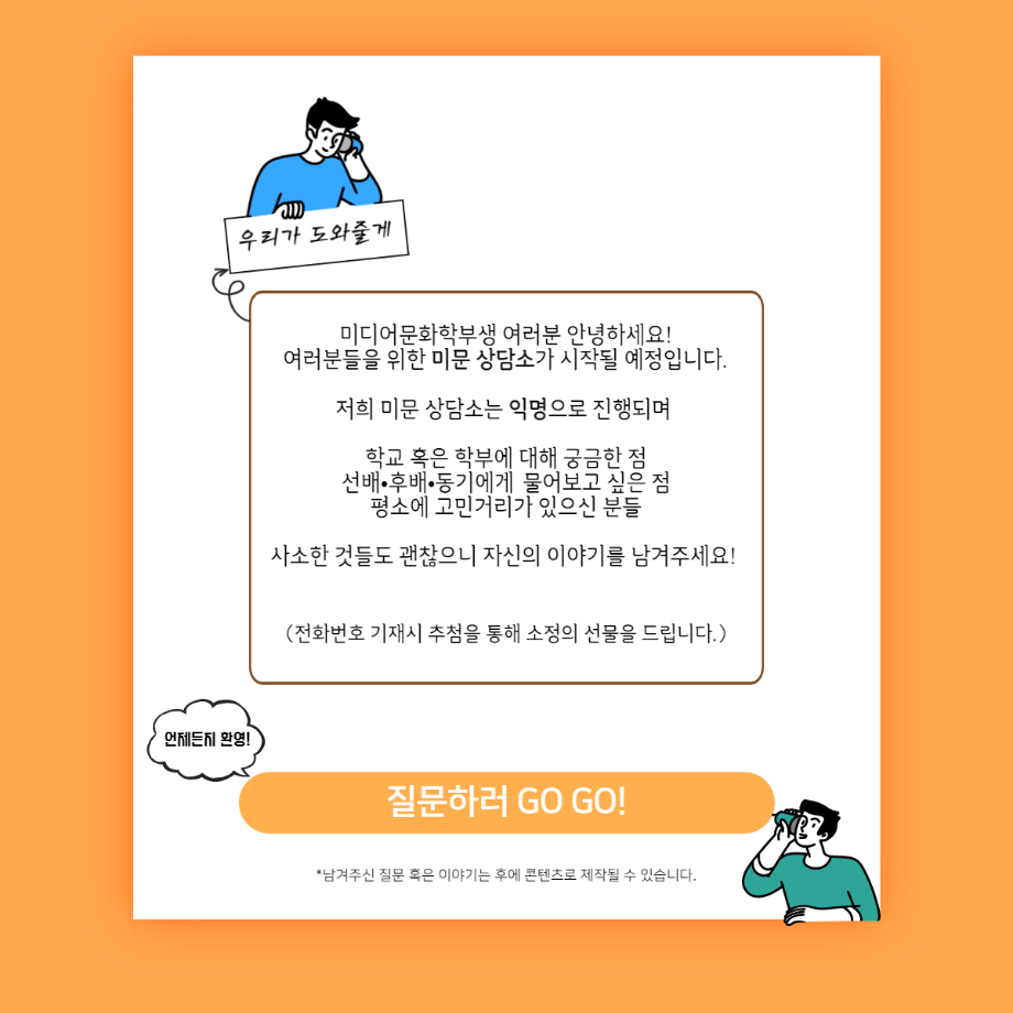 본문 시작 홈으로 커뮤니티 학부소개 교육과정 학부소식 커뮤니티 홈페이지가이드 학생회 학생회 동아리 자료실 장비대여 자유게시판 학생회 페이스북 트위터 프린트 [학생회 활동] 미문상담소 학생회 3247 2022-04-30 미디어문화학부생 여러분 안녕하세요! 미문 상담소에 대해 안내드립니다😊 학부에 대해 궁금한 점, 선배•후배•동기에게 물어보고 싶은 점, 자신의 고민 등 사소한 것들도 괜찮으니 자신의 이야기를 남겨주세요! 익명으로 진행되므로 편하게 작성해주세요 :) *남겨주신 질문 혹은 이야기는 후에 콘텐츠로 제작될 수 있습니다! (전화번호를 남겨주실 경우, 추첨을 통해 소정의 선물을 드릴 예정입니다.) https://naver.me/5okYea3H 목록 이전[학생회 활동] 2021-2 응원 간식 포장 다음 [학생회 활동] 2022년 1학기 선.사.친 활동 중간보고 담당부서 : 미디어문화학부 담당자 : - 연락처 : 043-649-1760 최종수정일 : 2024-10-26 만족도조사 만족도 조사 이 페이지에서 제공하는 정보에 대하여 만족하시나요? 매우만족 만족 보통 불만족 매우불만족